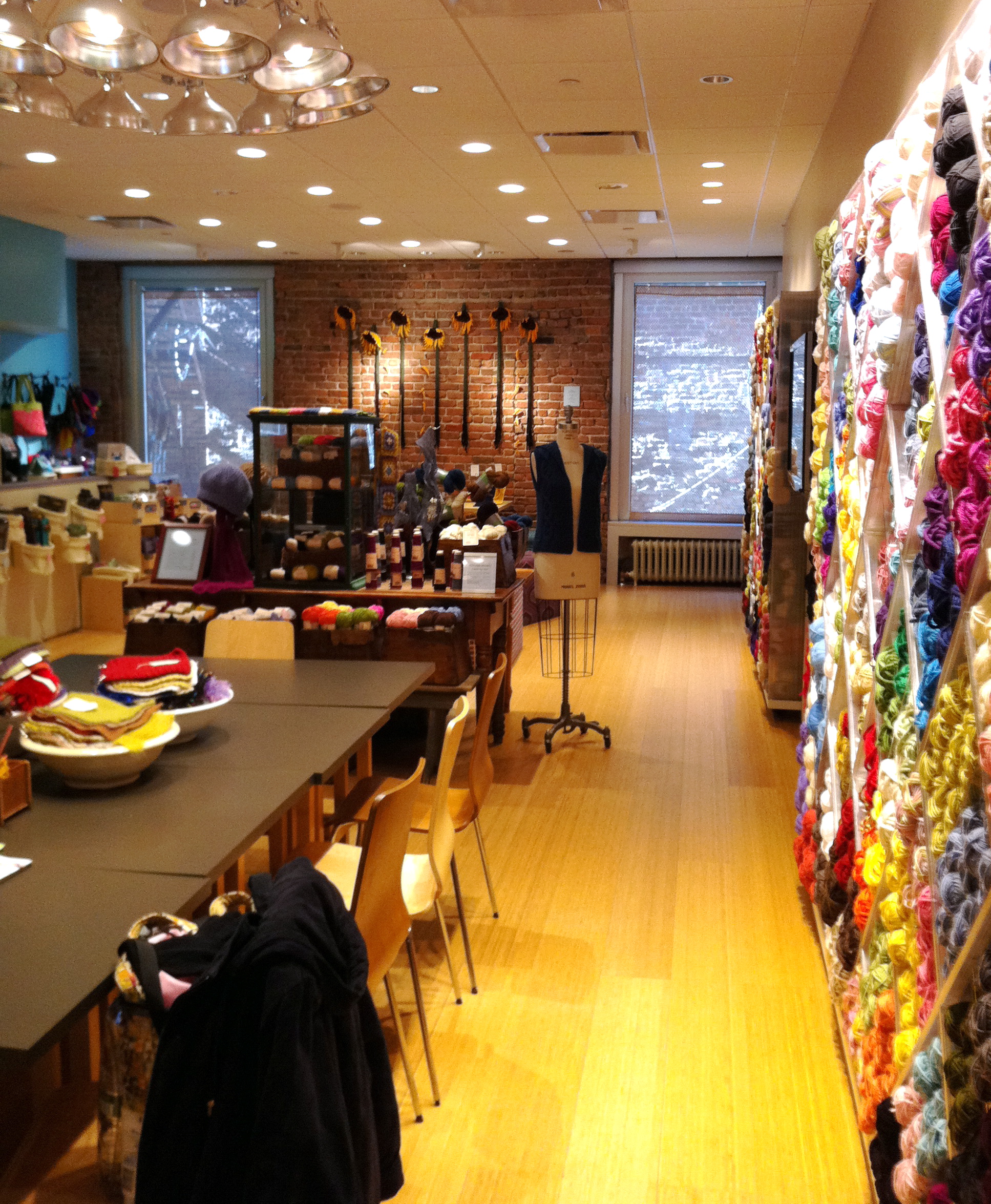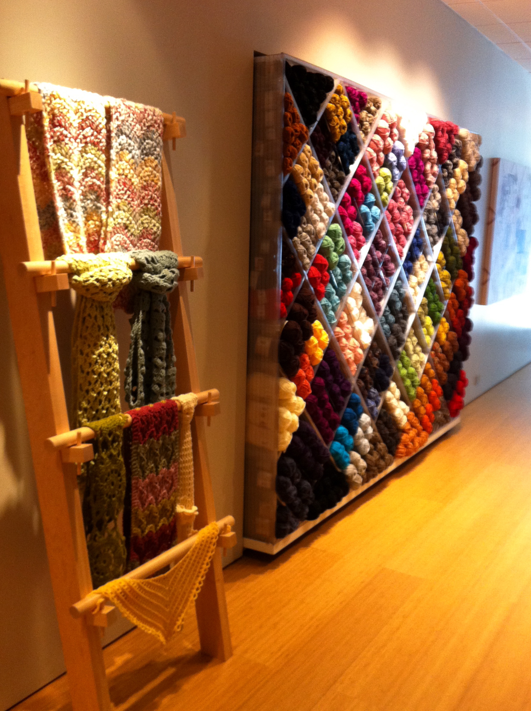The Lion Brand Studio was a beautiful space – open and loft-like with its high ceilings, industrial light fixtures and exposed brick. The displays were so colorful and organized – both things highly appealing to this Type-A gal. And the “Sampling Wall,” where you could cut off a length of a featured yarn and swatch with it while you’re browsing the studio? Brilliant! Here are just a few snaps that my trusty iPhone 4 took while I was browsing: