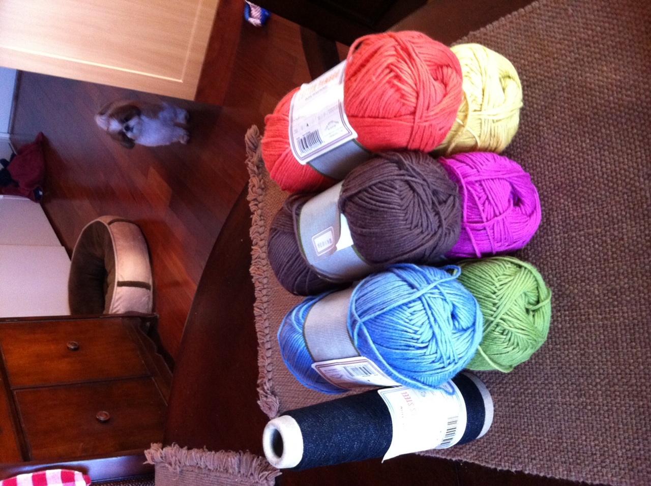 Naturally, I couldn’t see all of this great yarn and not be tempted! I especially loved the colors of the Cotton Bamboo yarn, so I grabbed up 6 skeins in 6 colors to swatch for a crochet baby blanket design for a cousin – I’m thinking this will be a gorgeous spring/summer palette! Spurred on by the recent posts of the Yarn Harlot, I also got a skein of their wool and stainless steel – that’s right, steel! – to play with and see if I can come up with some simple jewelry.