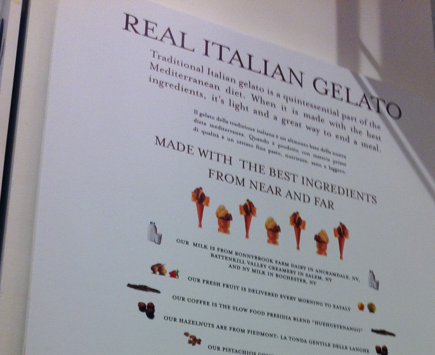 A very sweet ending - this sign for Eataly's gelato says that some of the milk comes from Rochester, NY! (and yes, the gelato was fabulous)