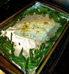Place the sheet in the upper third of your oven and broil it for approximately 5-6 minutes, watching carefully.  The fish is done when the entire top of the filet is opaque; it will also be golden brown in spots.  (NB: A thicker filet may need an additional minute or two).  When the fish is cooked through, remove the sheet from the oven and squeeze over the fish and asparagus the juice of half of the orange.  Toss the asparagus to coat and serve immediately.