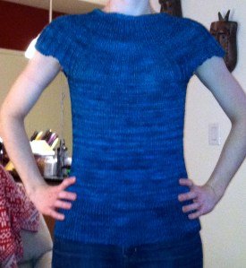 I love the fit and the tightness of the twist in the yarn – it ensures that the sweater will keep its fit and will wear well over the years. I prefer handknit items to be a little more close-fitting, because they will stretch with repeated wear. Of course, the sweater is also one of my favorite colors, not that you can tell exactly from this photo. Now it’s on to the sleeves, which hopefully won’t take long, as I’m itching to wear this sweater before the weather gets hot for good.