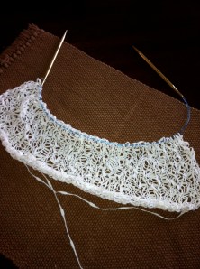 It was a weekend of slow, but sure, progress all around (even though the weekend seemed to go by in a blur, but that’s always the way….) First up: the body of the Madelinetosh Vintage sweater is finally done! And to show it off, I present this poor-quality-slightly-blurry-taken-at-night cell phone picture! (it’s the thought that counts.)