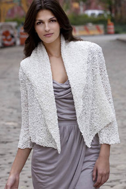 Now, my progress on the blue sweater hasn’t stopped me from casting on another project in the interim – my reputation for project polygymy is longstanding, and I can justify this one by saying that I don’t have a good subway/commuting project now that my Augusta shawl is done! I’ve cast on for the “Warren Jacket,” featuring the cool new Tahki Ripple yarn. It’s a 2 way jacket that can be worn “right side up” or “upside down” – here’s one shot from the latest Tahki design book: