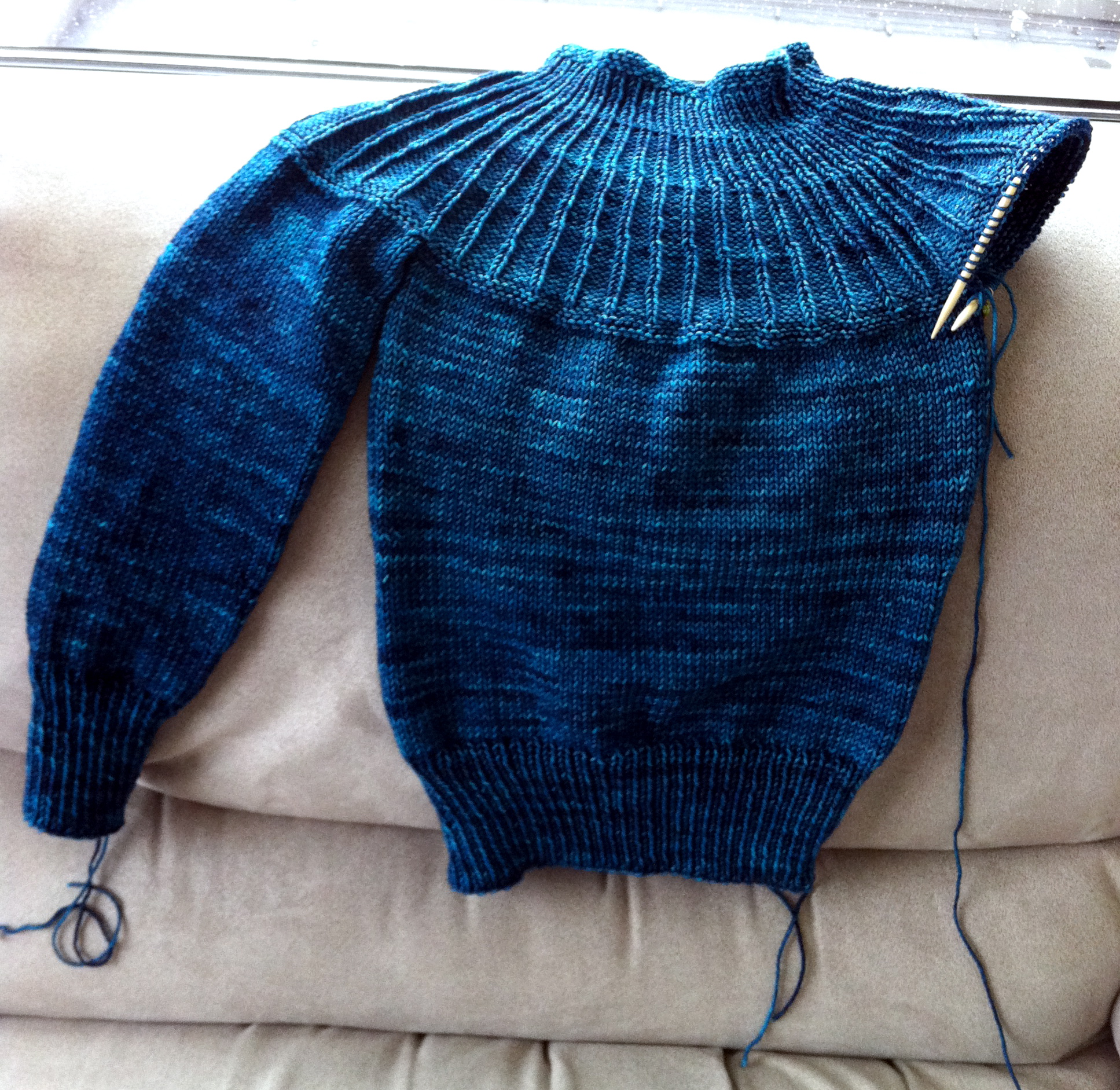Speaking of Madelinetosh, the blue sweater continues to grow! One sleeve is done (I made it longer than the original pattern – I’d much prefer to push my sleeves up than to wear 3/4 length sleeves, just another of my idiosyncracies) and one sleeve is set up and ready to be knit. I’m hoping to have this one done for sure in another week! This is a really crisp photo where you can easily see the stitch definition of the yoke, but the photo clarity is thanks to our crummy weather today:
