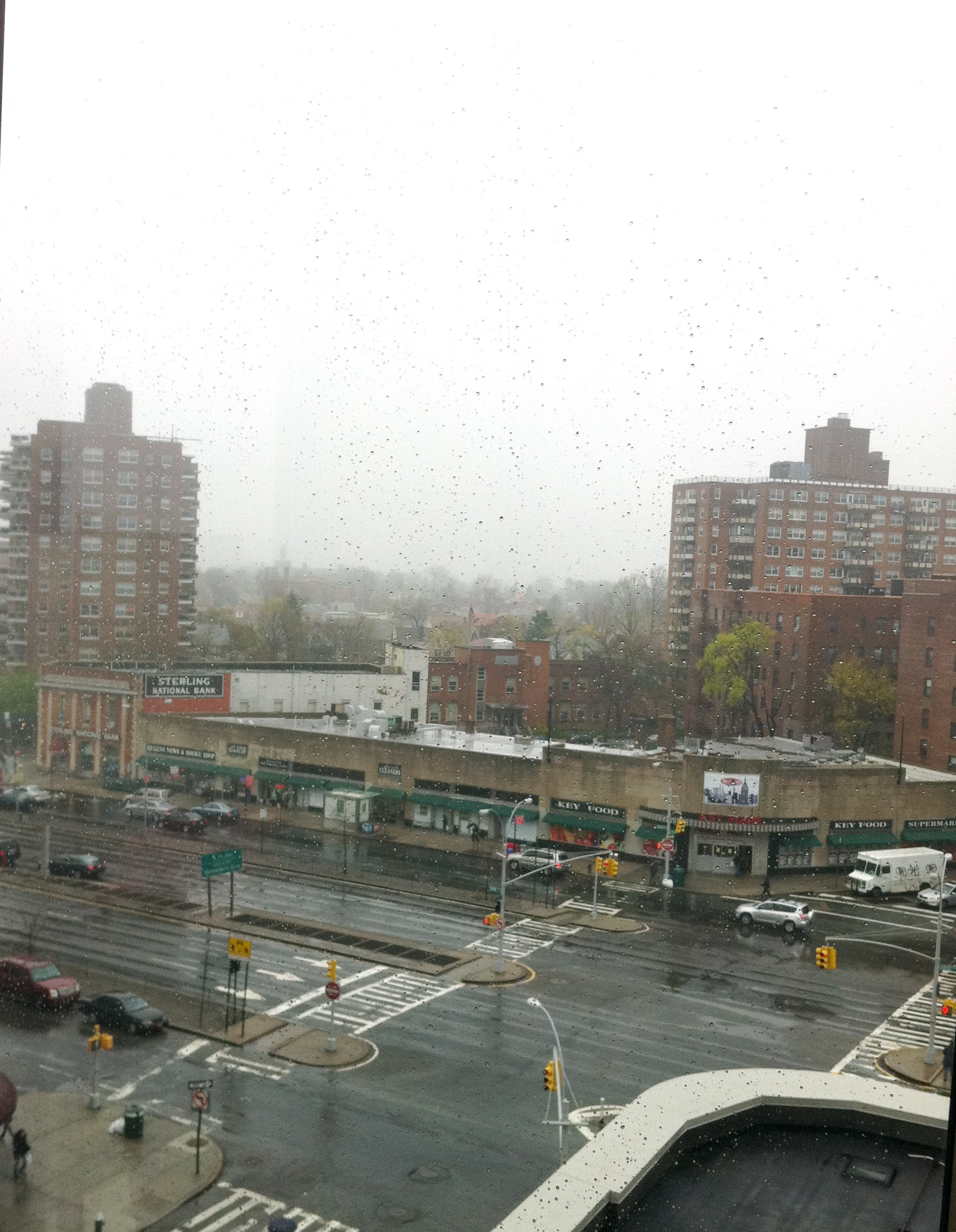 Overcast, rainy skies make for soggy Saturdays, but great photos! Normally, you can see Shea Stadium and the planes taking off from LaGuardia Airport between those two tall buildings, but today it looks like a solid grey sheet.