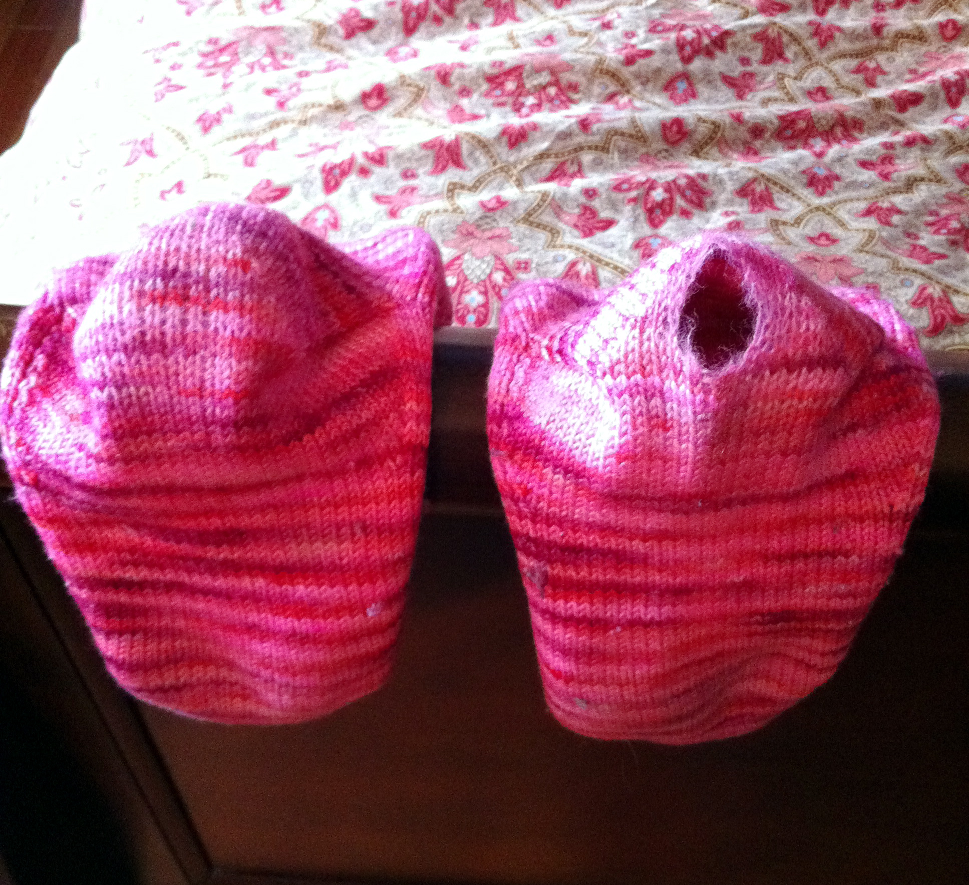 In somewhat sadder knitting news, I have a casualty to report: one heel of my first-ever pair of knitted socks has a huuuuge hole in it. You know how you get that feeling that the bottom of your foot is cold, or wet? It’s the sure sign that you’ve got a hole and boy, do I have a doozy: