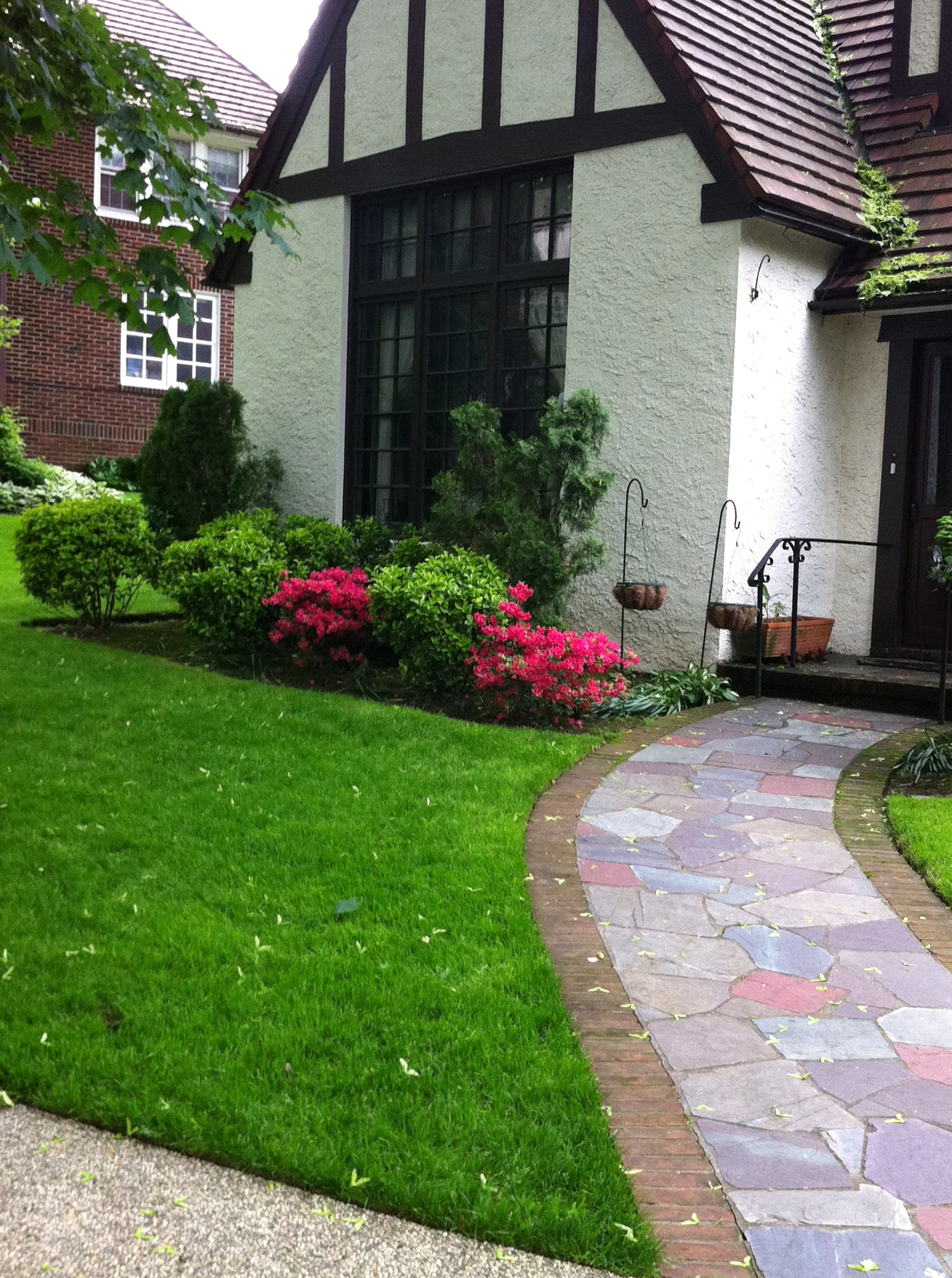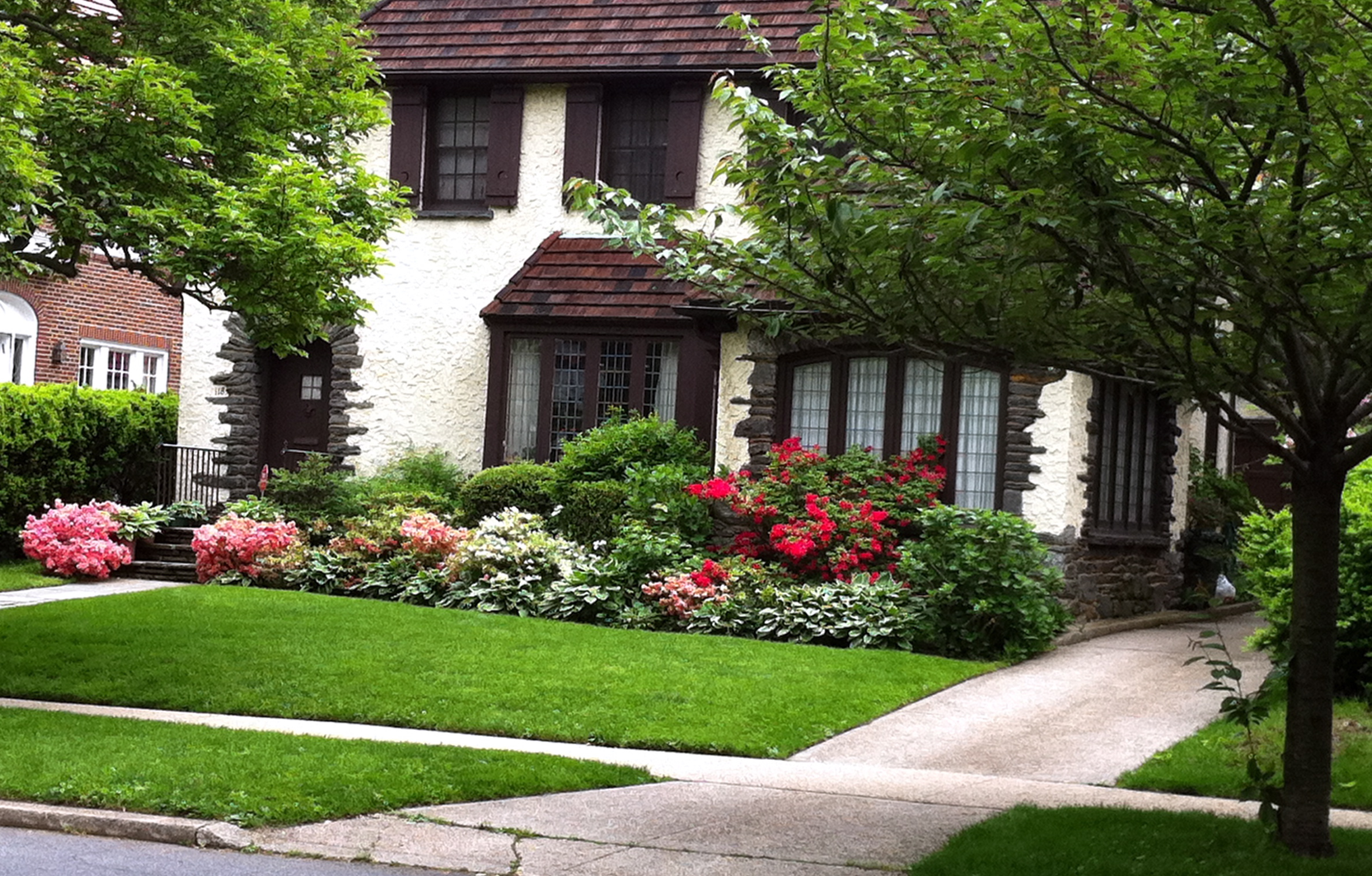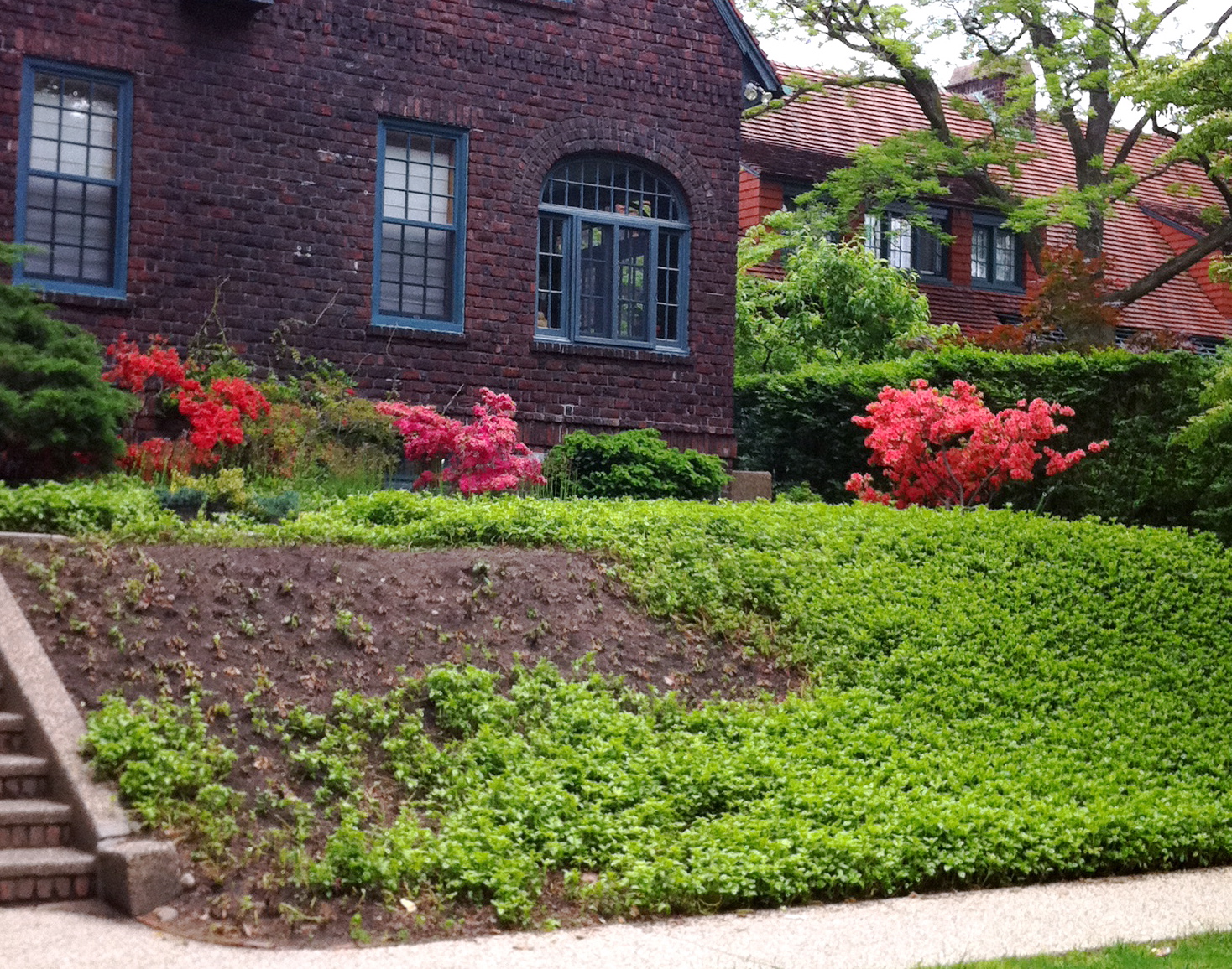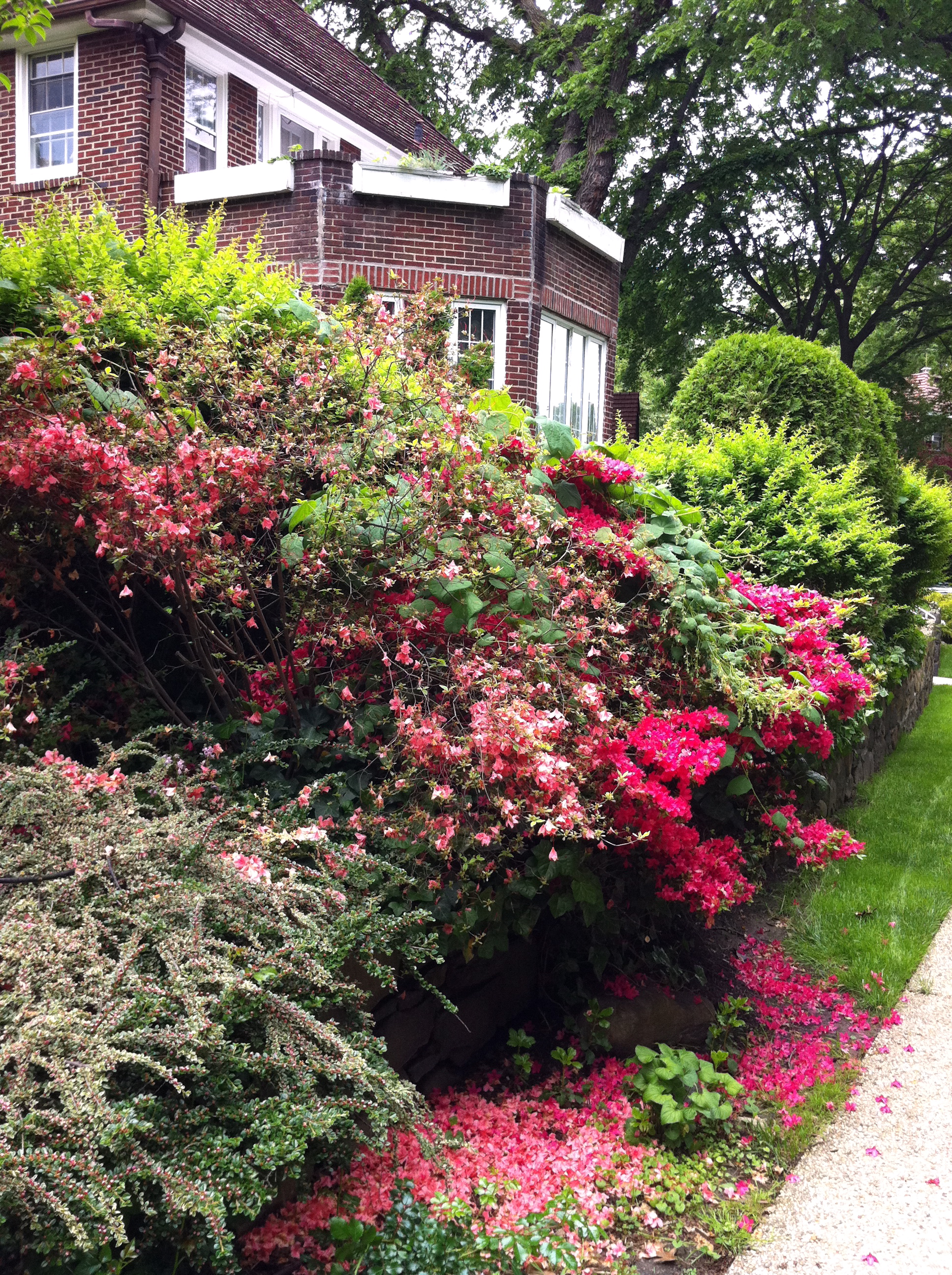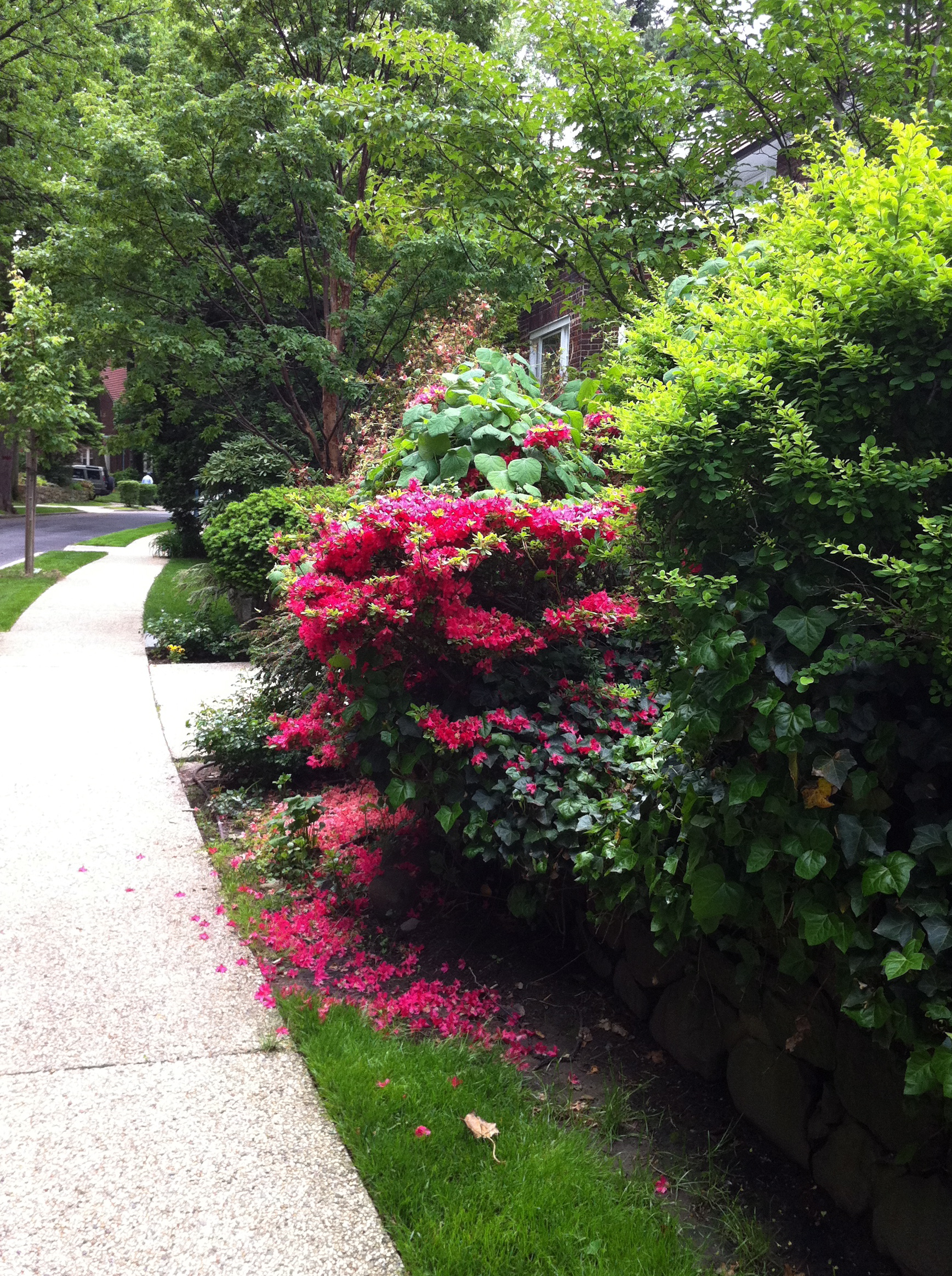 The sun finally came out in our corner of the world today, and it was so welcome. We went to a baby naming ceremony this morning in Brooklyn, and the weather was perfect. When we got home, I hit the pavement for a quick walk. Forest Hills Gardens is a “private” planned community adjacent to our neighborhood and it’s got all kinds of building/HOA rules so that all of the homes have a similar look and style. Well, all of the rain has also ensured that all of the lawns and plants are totally lush, too. I had forgotten how popular azaleas are the in FHG area – looks like I missed their peak, but there were still some great examples in bloom and in shedding mode all around: