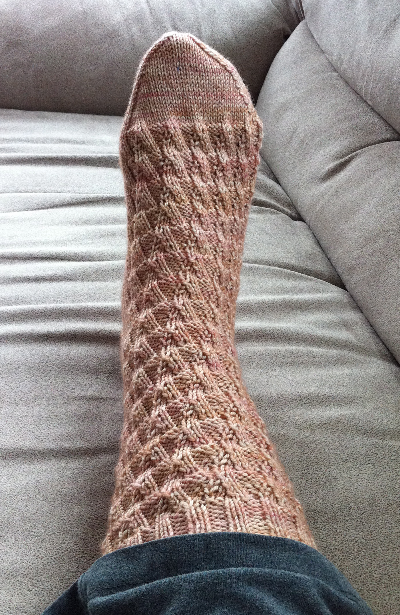 Folks, it is seriously hard to photograph a sock well when it’s on your own foot! Oh well, you get the gist. You can see how cushy/springy the fabric is, so as I said, there’s room in this size for a bigger foot. I’ll do the math for a few smaller sizes and get that pattern out into the Ravelry-universe for testing. I’m aiming for a pattern release in early June at this rate!