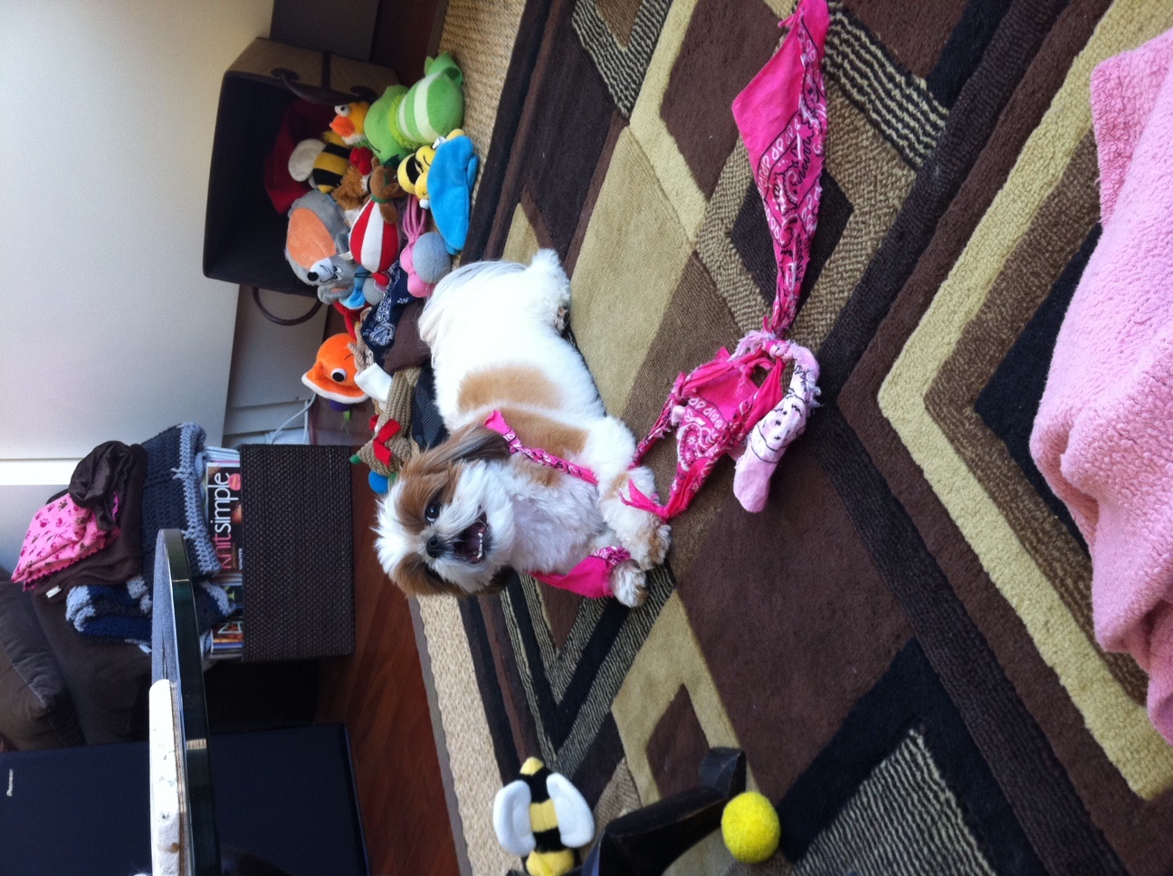 And since we can never have a week go by without a status check from our official MWD mascot, here’s a recent picture of Coco the Crazy, awash in her own horde of toys. She does make a mommy proud.