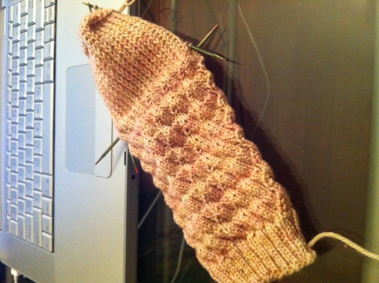 First up – the latest progress on the 2nd Hideaway Sock. We’ve turned the heel, folks! (Forgive the “photo’ed on my desk at night with bad lighting” quality.)