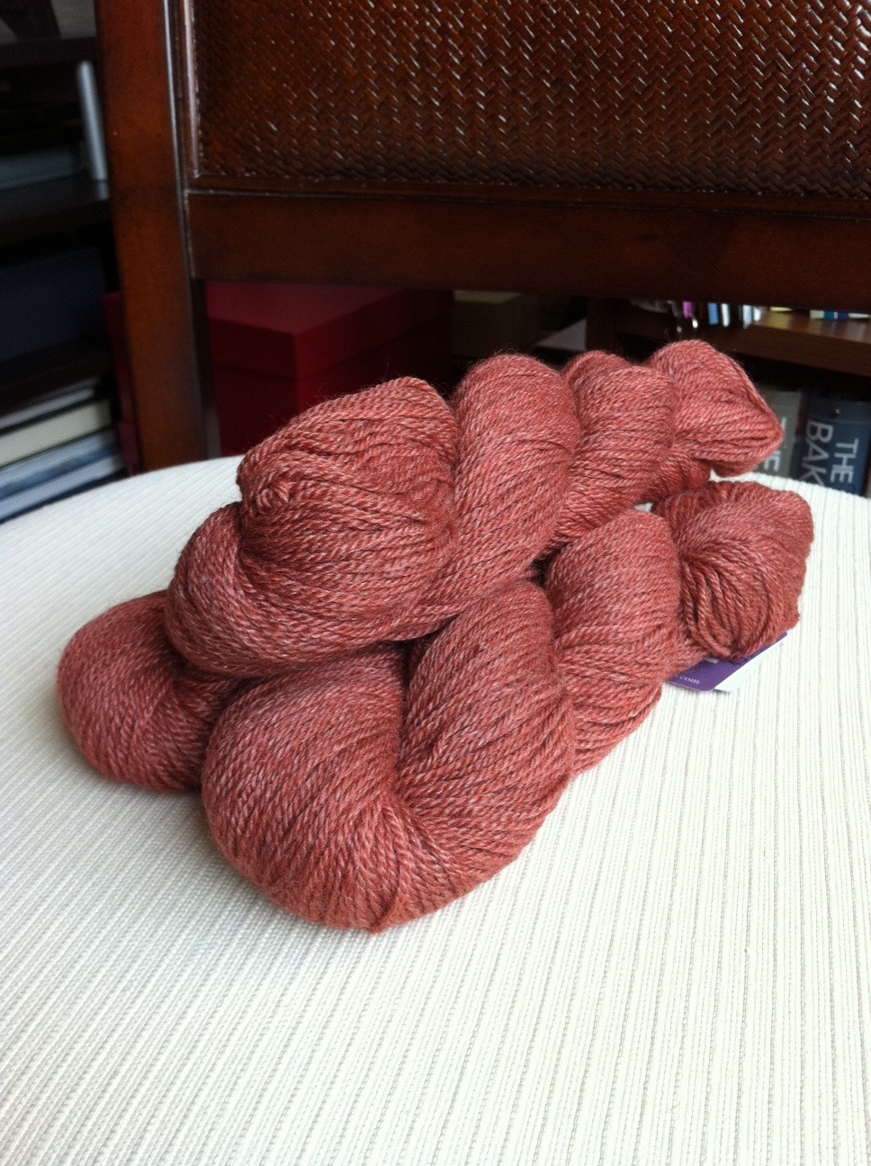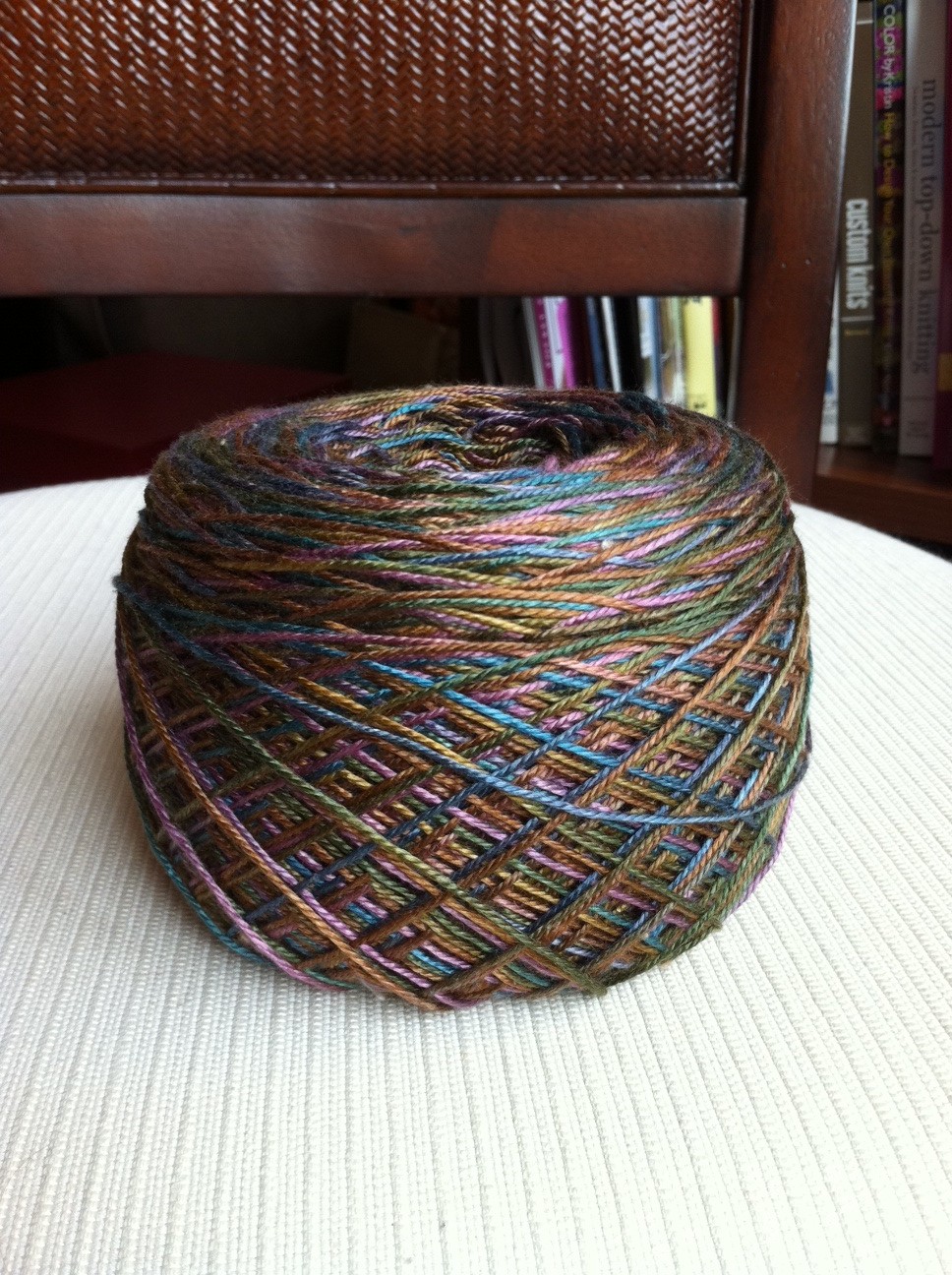 A big hank of Sea Silk from Handmaiden in Canada in my favorite colorway of theirs, “Paris.” (Right, like you couldn’t have guessed that one….) This is an unusually large skein of Sea Silk with approximately 650 yards, rather than 440 yards, because of a mistake in its production. So I’ve been thinking about a lacy rectangular stole worked up on a larger-than-recommended needle to maximize the given yardage. The winding is the easy part – now to swatch and actually pick a stitch. You’ll be seeing a lot more of this one, and I have a feeling it’ll go pretty fast. And if you haven’t seen and/or worked with Sea Silk before, it’s the dreamiest blend of silk and seacell – any finished project has amazing sheen and unparalleled drape. I’m a huge fan, so if you ever see it in a shop, my advice is always to grab it up before it’s gone!