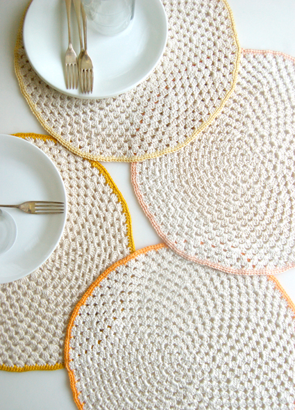So, how about a third linen project? I know, it’s becoming an obsession. Last weekend, Purl Soho, the famous knitting/crocheting/sewing store downtown in NYC, sent out their newsletter featuring….Granny-circle crocheted placemats!