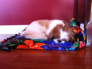 In a couple days, we’ll be off on our mini-vacation to celebrate my father’s birthday and have a family reunion, too. It’s always a fantastic time – an entire weekend of food, pool time, games, fireworks, and general mayhem. For Coco, it’s a chance to run around in grass as far as the eye can see, so we call it her “summer camp.” You can see here that she’s already dreaming about it.