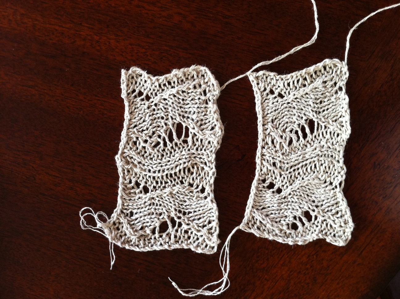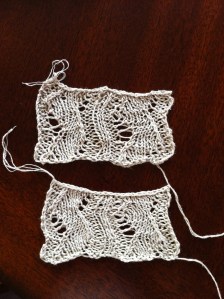 Now that my big wrap is finished, minus the pattern writeup (which by the way, I’m going to add a scarf and larger wrap to, so that the pattern will include 3 sizes…I’ve already had Jane, a great Raveler, work up the scarf version and it’s great! So thrilled), my polygamous nature already has me swatching for those linen projects I mentioned last time.