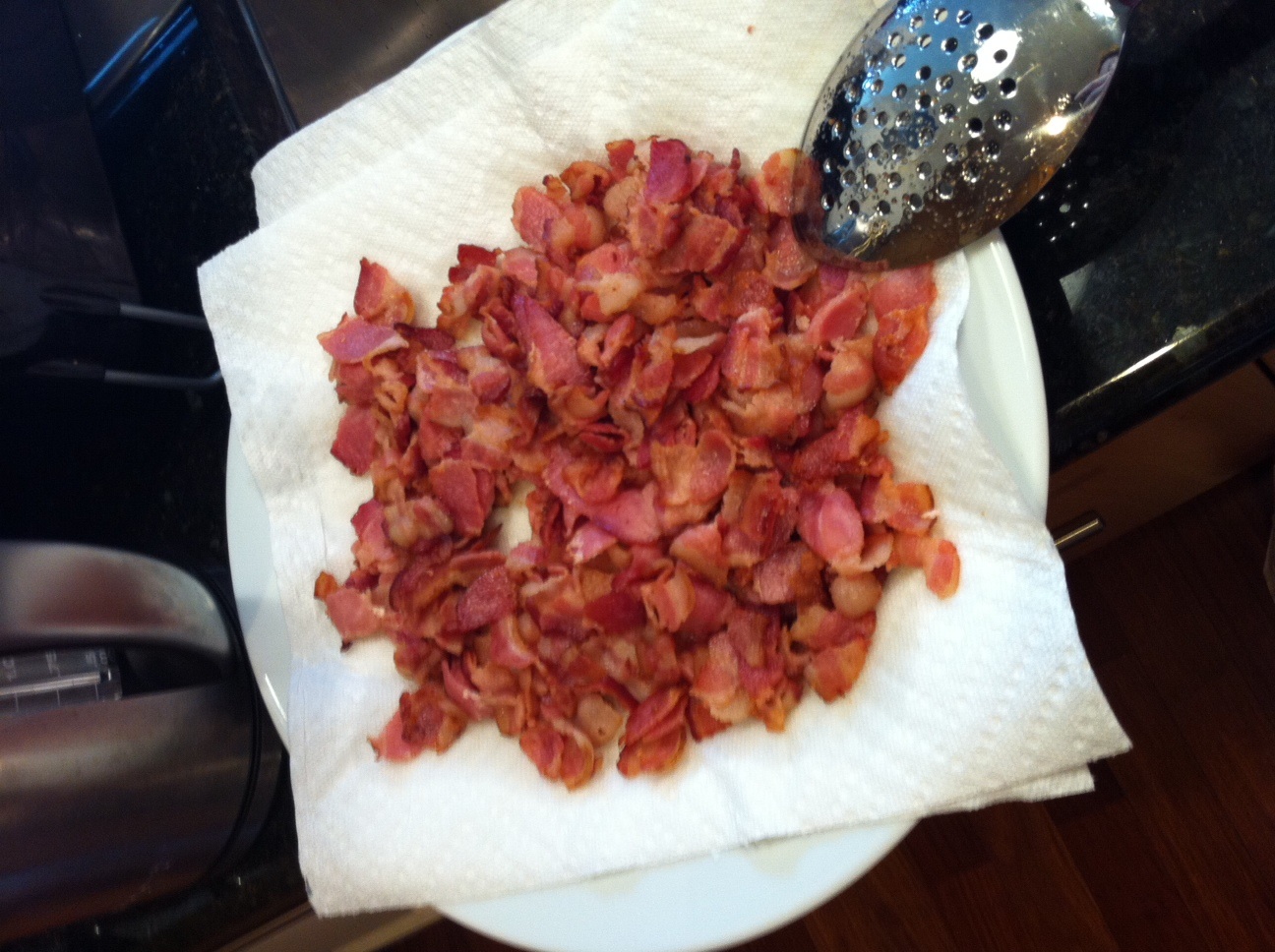 As I mentioned in my previous post, this last Saturday found me puttering in the kitchen while the rain came. Ever since I’d seen this recipe months ago for “Bacon Jam,” I’d been curious to try it – I mean, it’s essentially bacon and sugar – how could it be bad? Well, folks, I’m here to tell you that it’s one of the most delicious things I’ve ever eaten. AND, I’ve got a modification to the recipe, thanks to my mom, to make it even speedier! (Instant gratification, after all, being the goal with these types of things.)