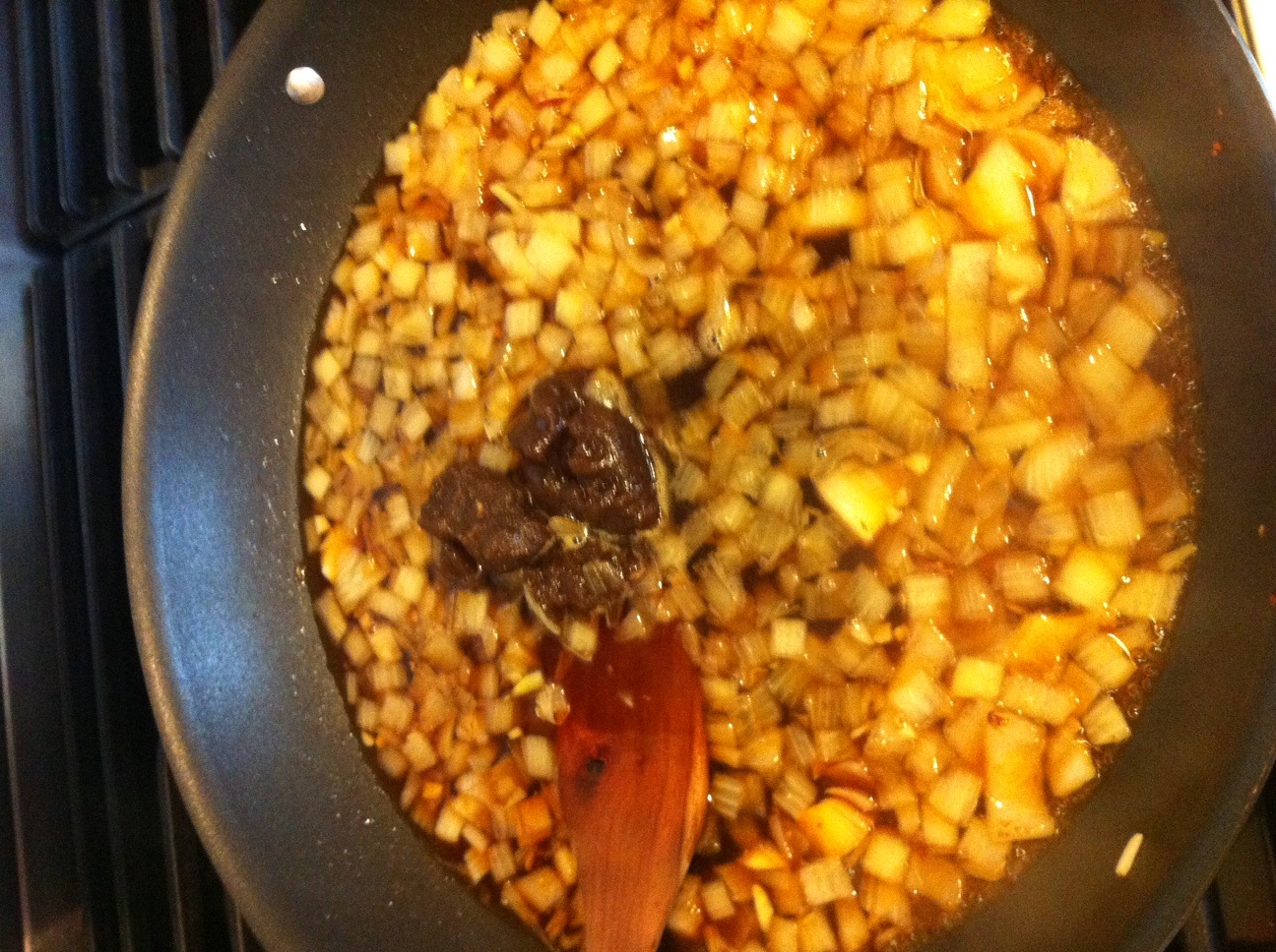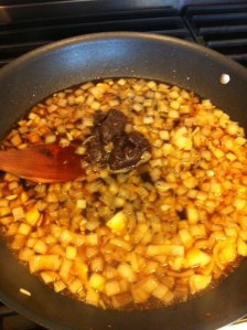 What’s that big brown lump in the middle? That’s the dark brown sugar and maple syrup melting into the onions/garlic mixture, along with some strong coffee and some apple cider vinegar. The smell alone of this combination is heavenly, at least for me – it’s reminiscent of my mom’s warm German Potato Salad that’s made with bacon, potatoes, and a vinegar dressing (also one of life’s great pleasures). So once I smelled that smell, I knew I’d be happy.