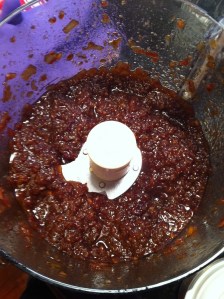 The final step is to pulse the mixture in the food processor to get a more jam-like consistency. I think the only trick here is to cover the opening in the lid of the food processor with a towel, to let the heat escape into the towel without having the lid blow off! (Like my purple rubber gloves in the background? Those were to protect my hands/wrists when transferring this boiling sugary liquid…) This was a quick process – only a few pulses and it was ready!