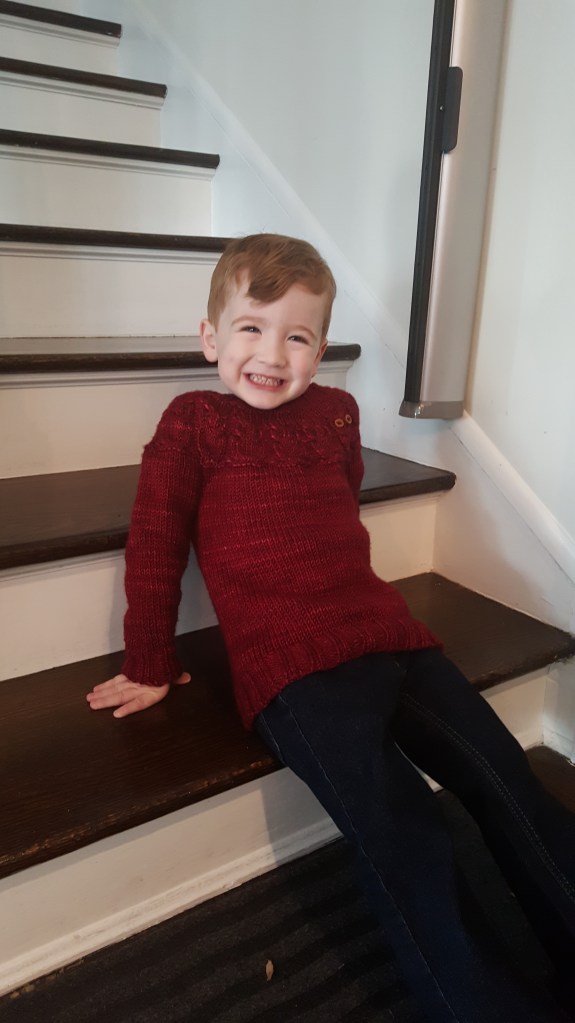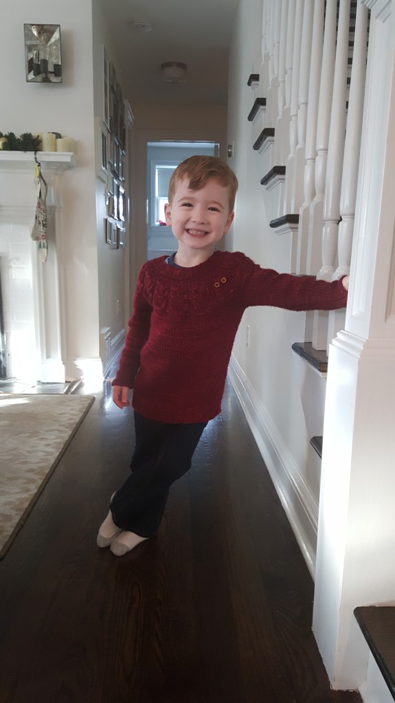 His birthday sweater is Owlet, knit in Madelinetosh Tosh Chunky (colorway “Tart” because his favorite color has always been red). And yes, I combined 3 different sizes in the pattern to get the right mix of stitch gauge, sleeve/body length, and overall circumference. Knitters can never leave well enough alone 😉