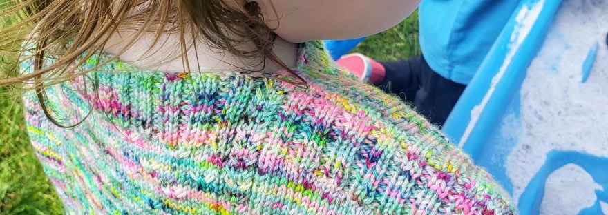 This design was a departure for me, as I don’t often design children’s garments or work with such variegated yarns.  But I enjoyed the challenge of it and genuinely love the result; it suits Nina and her personality to a T.