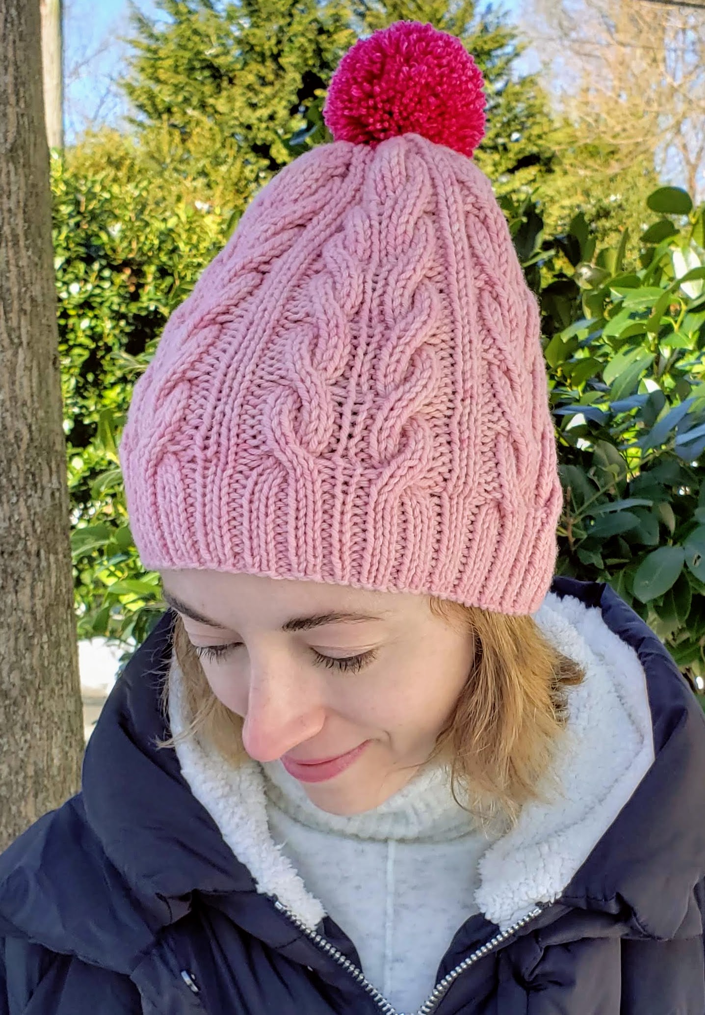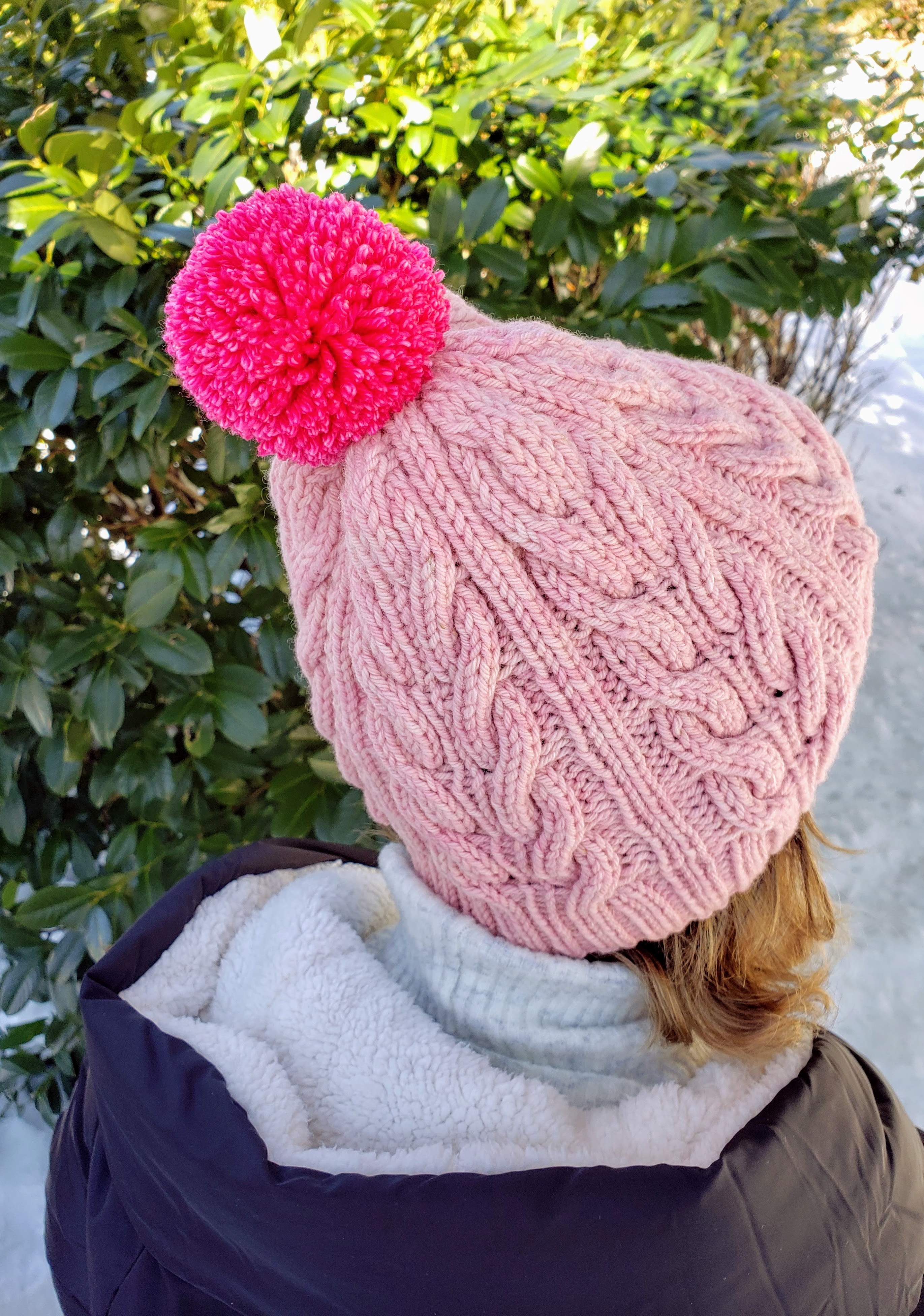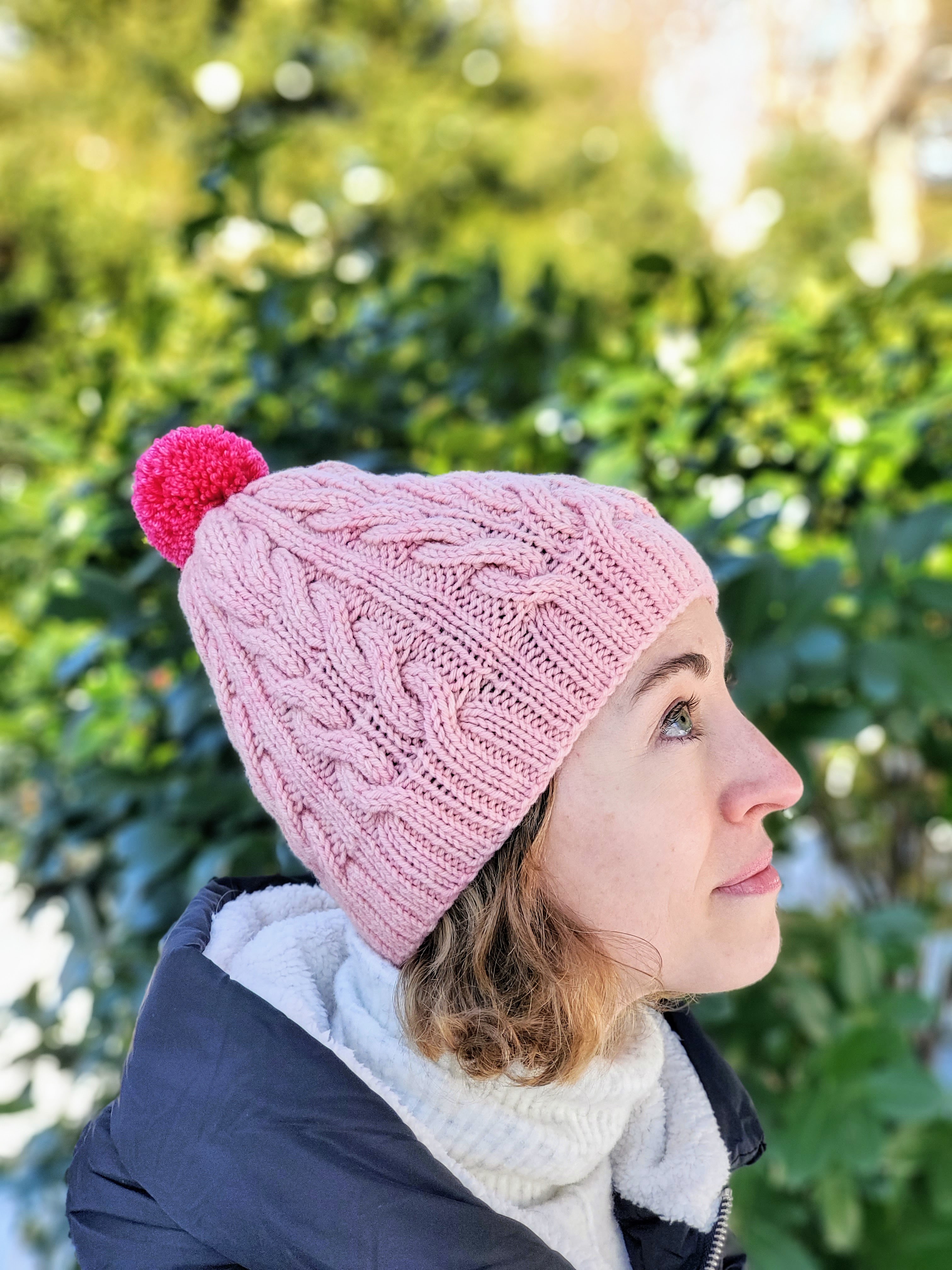 Repeatedly fiddling with the crown shaping on this design until it was just right really did pay dividends. The hat turned out just as I imagined, and I love everything about it: the fun pink pop of color on a drab day, the cables, and the fit. (Not to mention that neon pom-pom using some yarn I had left over from Nina’s most favorite “dark pink hat.”) I hope that you’ll find the same joy in making something timeless, but lighthearted, for all the members of your family.
