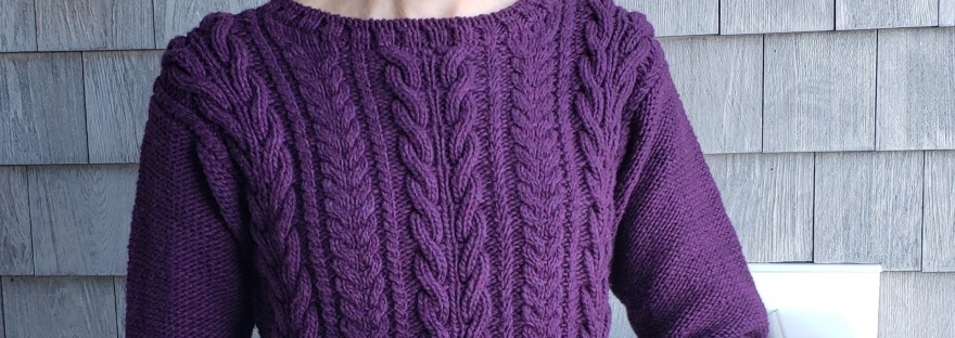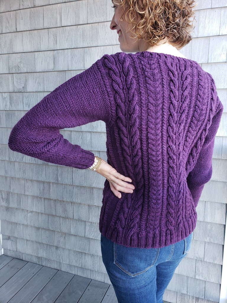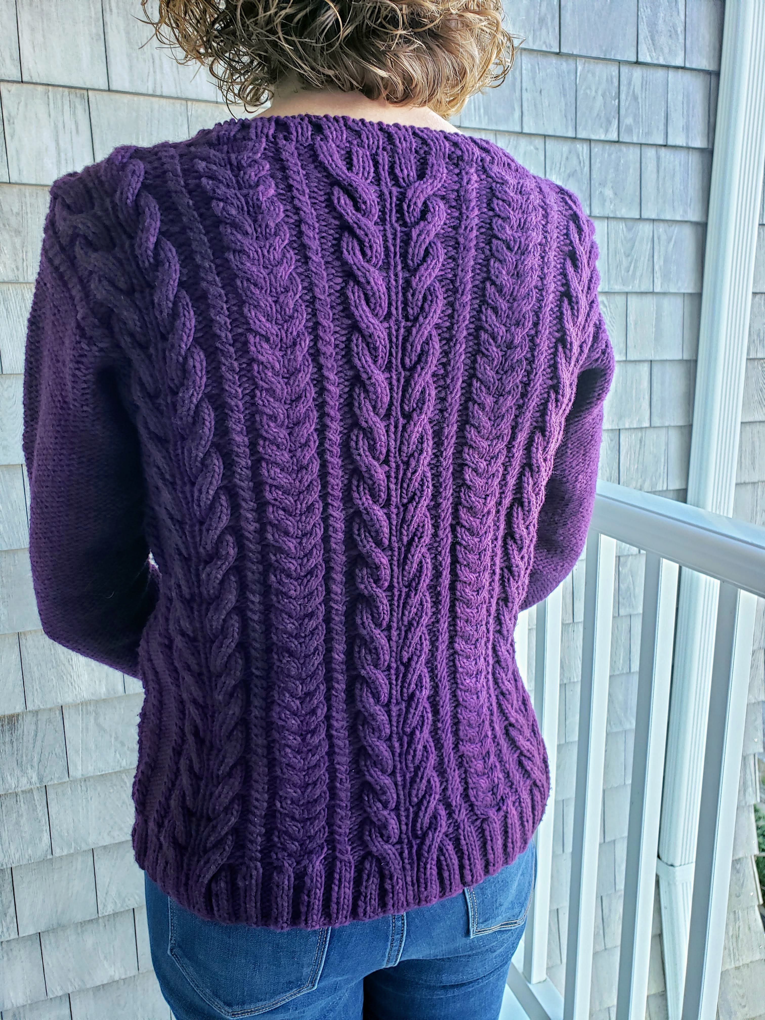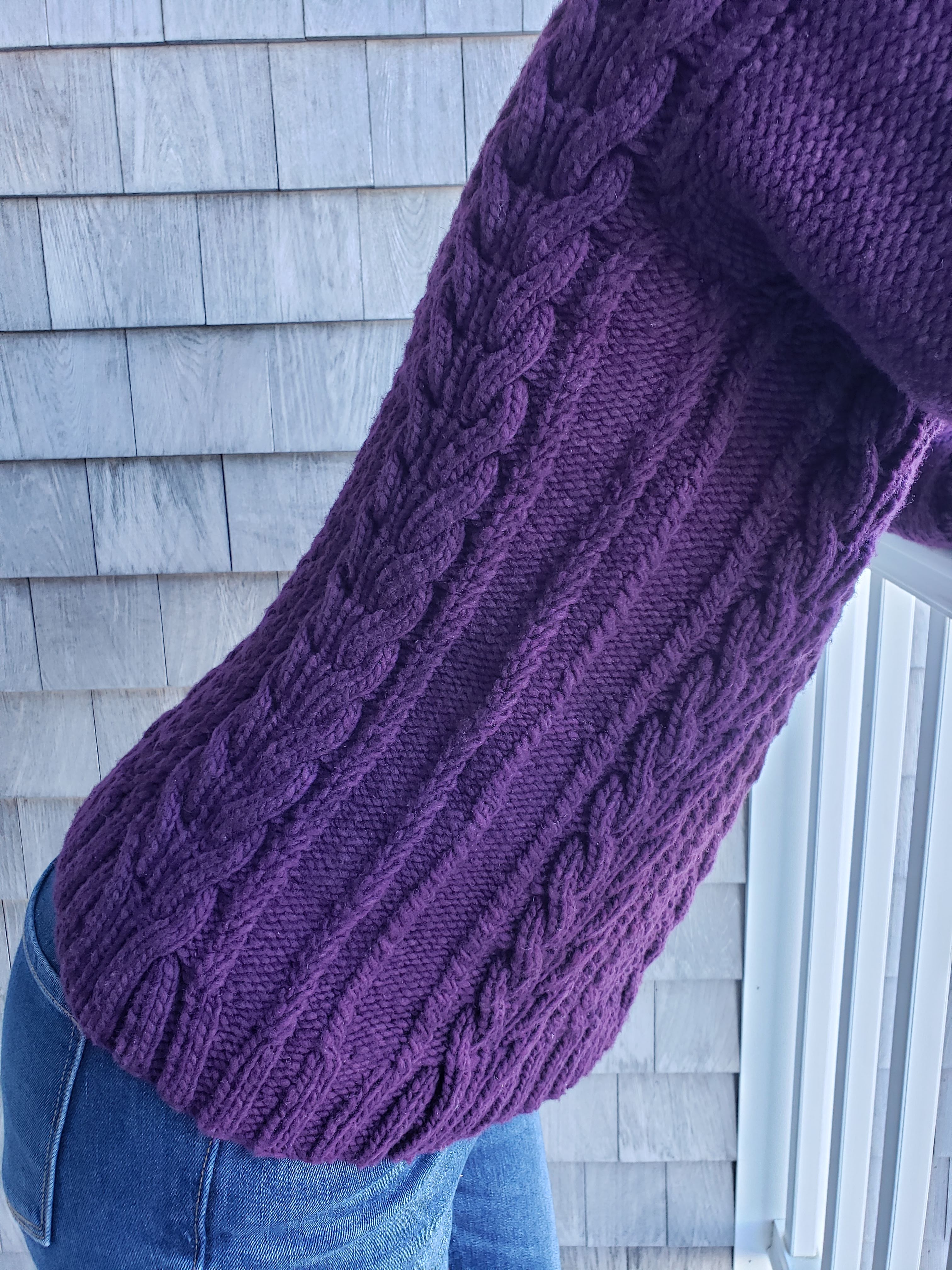 Because this design is so highly textured, I strongly recommend a mostly-solid or solid colorway of yarn, which brings me to the very special yarn that I used: Saxon Merino Worsted in “Purple Sage” by Catskill Merino. In the past at the NY Sheep and Wool festival, I’ve had the privilege of speaking with Dominique, the shepherdess at Catskill Merino who dedicates her full heart to a flock of Saxon Merino sheep in the Hudson Valley. The fleece from these sheep is spun into superfine Merino yarn that is so soft to knit with and wear, is hand-dyed in a rainbow of rich, saturated colors, and produces fabric with excellent stitch definition. The pandemic prevented the NY Sheep and Wool festival from happening in person in 2020, so I purchased this yarn during the first “virtual” Rhinebeck festival. Dominique and the other vendors went to incredible lengths to bring their wares online and show us a bit about the animals, farms, and people behind these unique yarns. When I look at this garment, it reminds me of that weekend when we didn’t let the pandemic prevent us from gathering in spirit. This is my second piece knit with this wonderful yarn (I also designed my Flint Hill Shawl using Catskill Merino’s fingering weight yarn in Clover) but it won’t be my last.