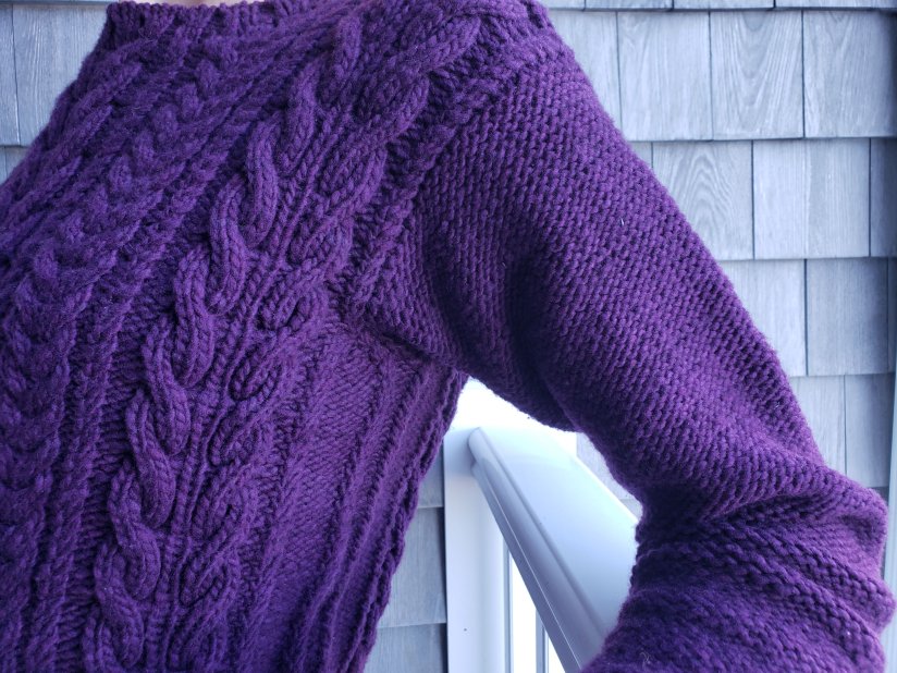 This pullover shares the essential elements of my original design. It features the same weight of yarn (worsted), the same crew neck shaping, easy-to-knit (and easy-to-wear) modified drop sleeves, and the same tubular ribbed edges that provide that professional finish.