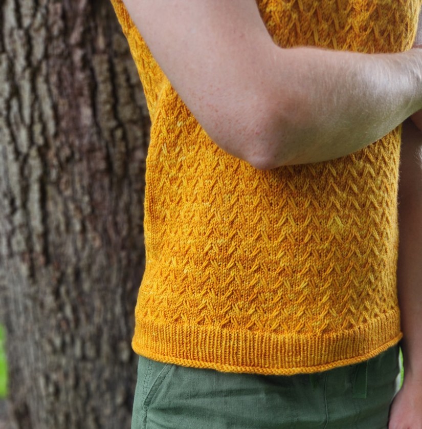 My newest design is also a fun first! Designed to be knit in your choice of either one color or two colors, this is the Cornsilk Top.