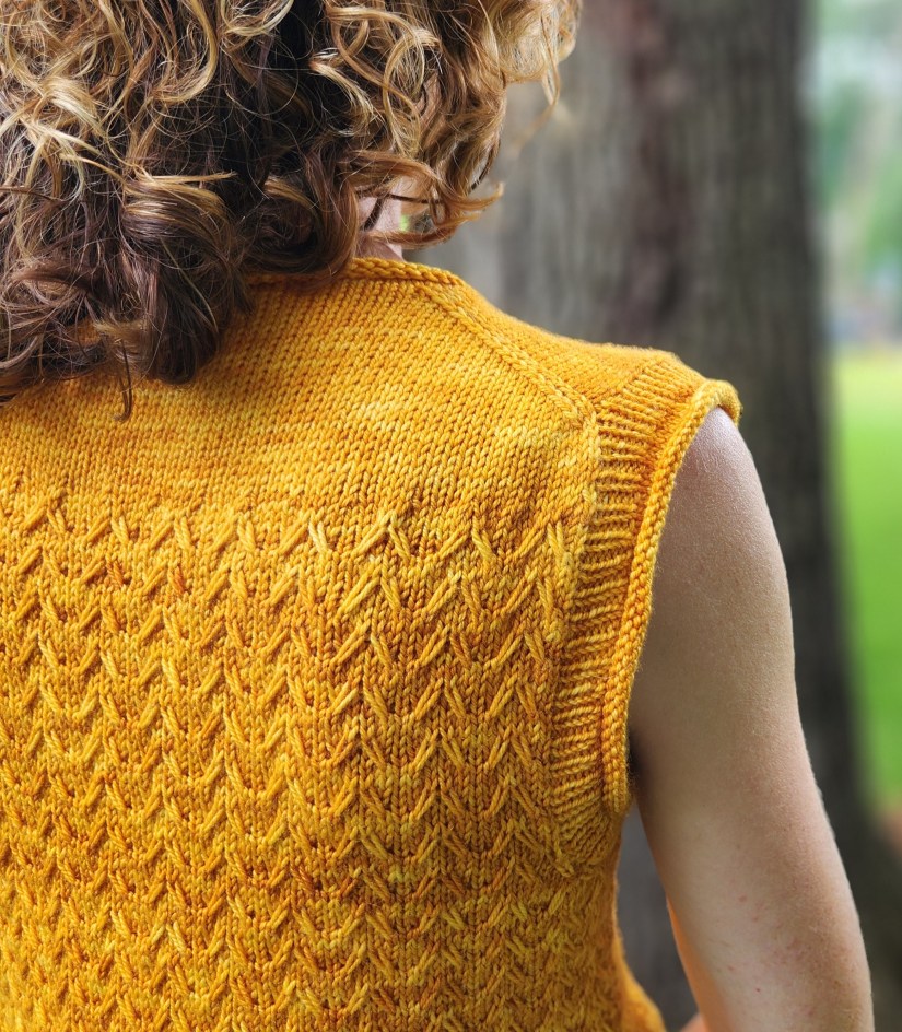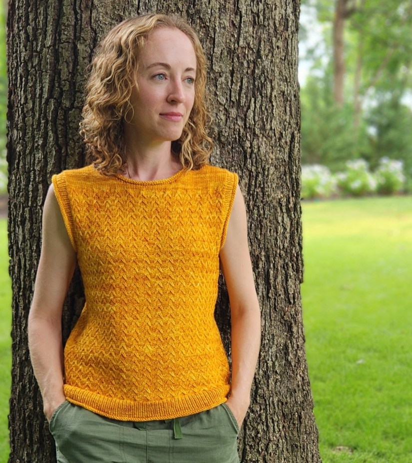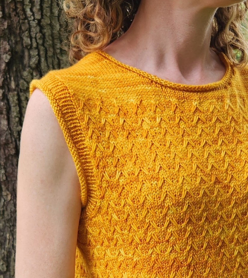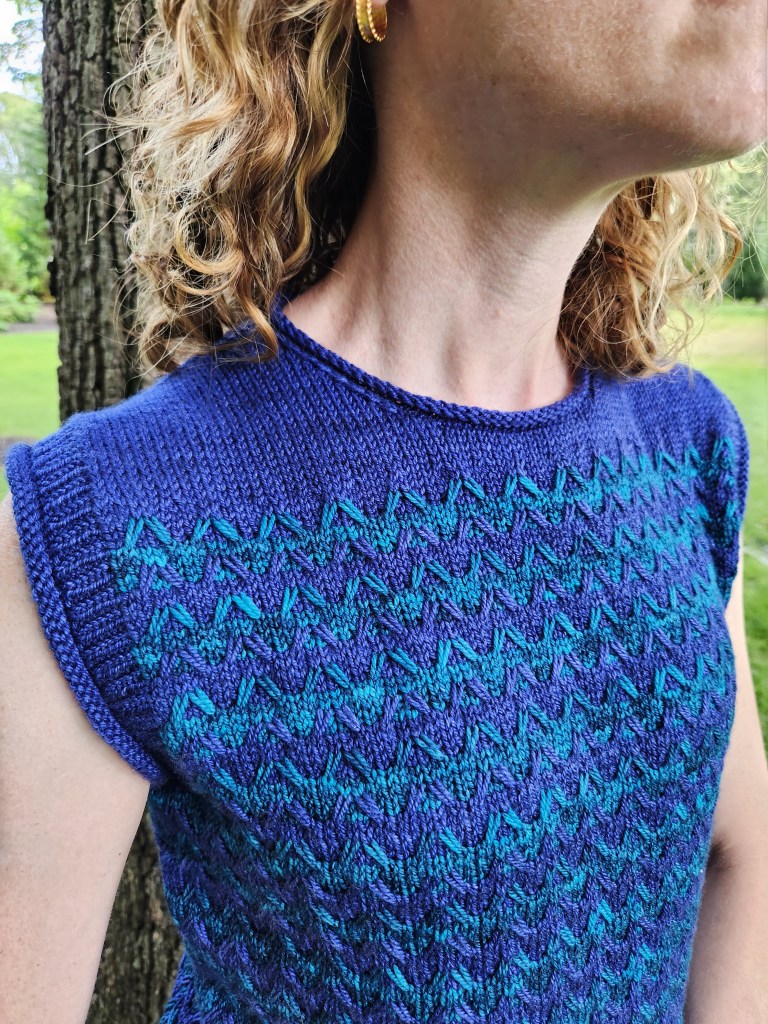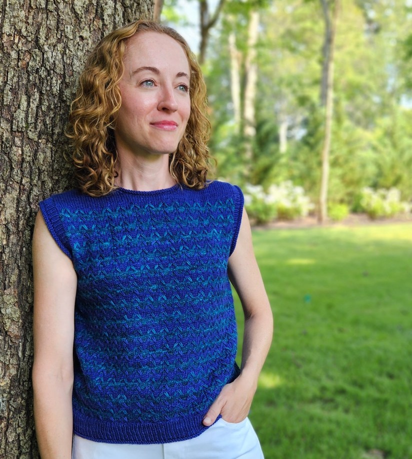 Now for some of the design details. In keeping with the warm weather, easy living aesthetic that I had in mind, I kept the overall shape relaxed and casual by including 2-3″ of positive ease in the chest measurement. Both the hem and the armholes feature a ribbing with a rolled edge. The stretchiness of the rolled edge makes the garment easier to take on and off and also makes the edges easier to cast on and bind off. The crew neck features a no-fuss rolled edge without any ribbing. Without sleeves, the top is perfect on its own in warm weather and as a vest or second layer on colder days.