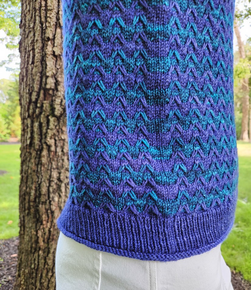 The top is knit in the round from the bottom hem upwards until you reach the armholes. Then the front and back are worked separately and seamed at the shoulders before the final edges are added. The pattern includes ten sizes for finished chest circumferences between approximately 36″ and 70″ (90-180 cm), including that positive ease I mentioned earlier.