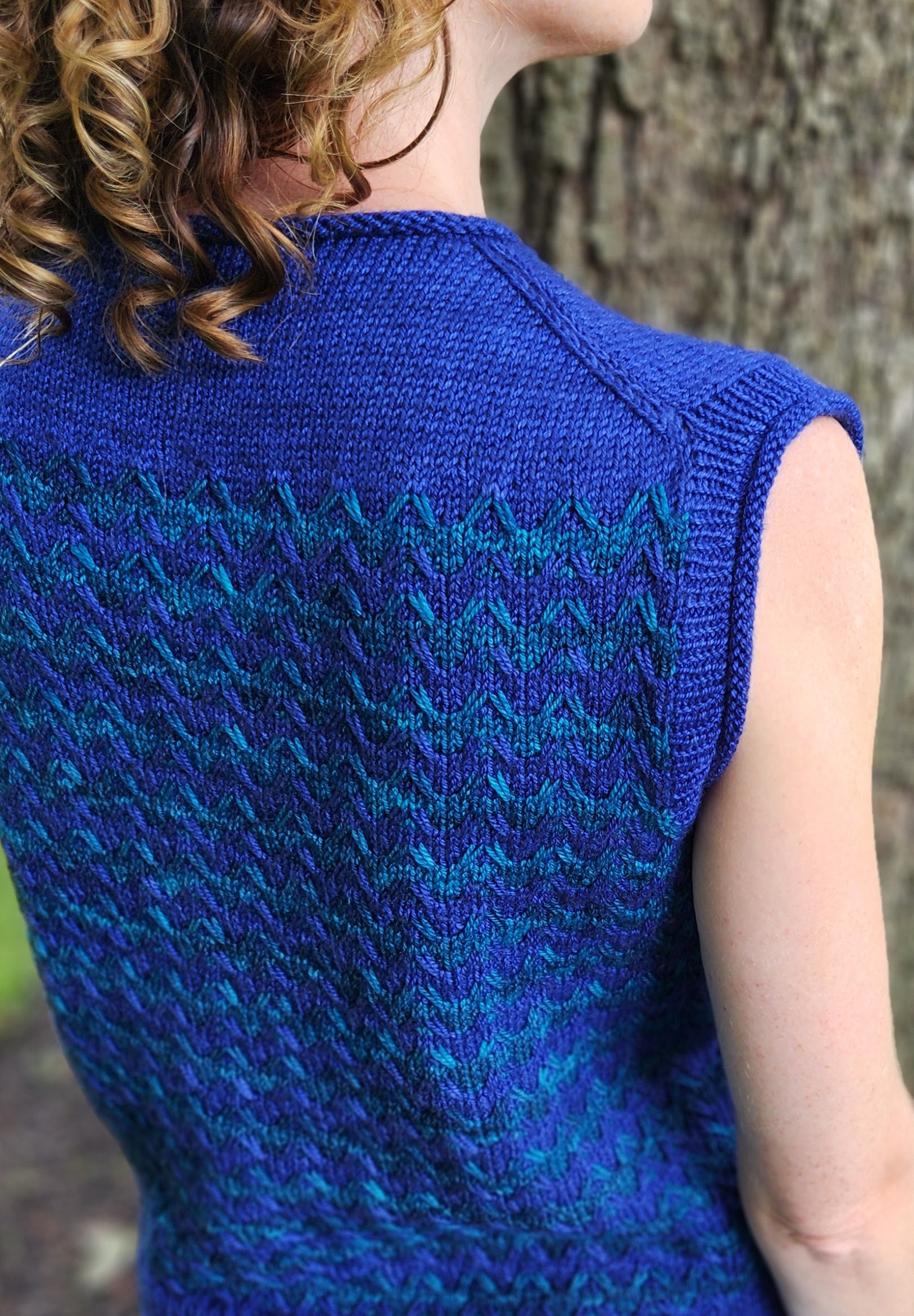 For a long time, however, I waited for design inspiration to strike. Pashmina is often used for knitting luxurious accessories, but I wanted to create a garment to really show off the yarn’s drape and its depth of color. I was perusing my stash one day when I realized how well two colorways of Pashmina, “fathom” (a luminous sapphire blue) and “baltic” (a shifting kaleidoscope of blue-green shades), complemented each other.