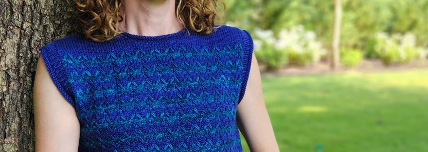 Now for some of the design details. In keeping with the warm weather, easy living aesthetic that I had in mind, I kept the overall shape relaxed and casual by including 2-3″ of positive ease in the chest measurement. Both the hem and the armholes feature a ribbing with a rolled edge. The stretchiness of the rolled edge makes the garment easier to take on and off and also makes the edges easier to cast on and bind off. The crew neck features a no-fuss rolled edge without any ribbing. Without sleeves, the top is perfect on its own in warm weather and as a vest or second layer on colder days.