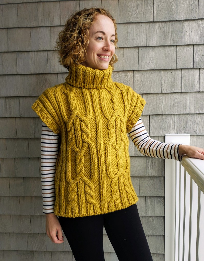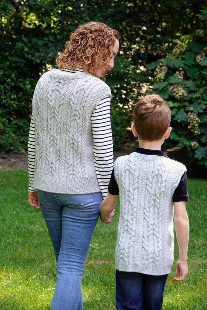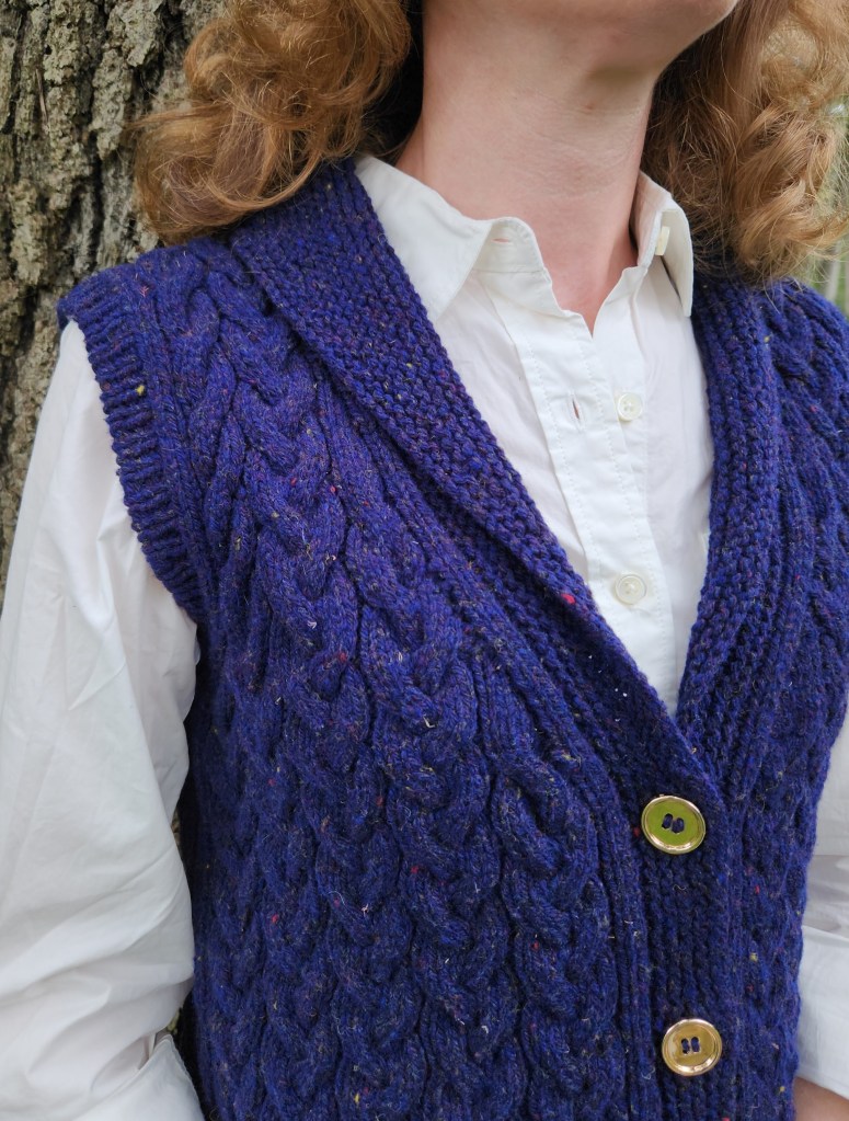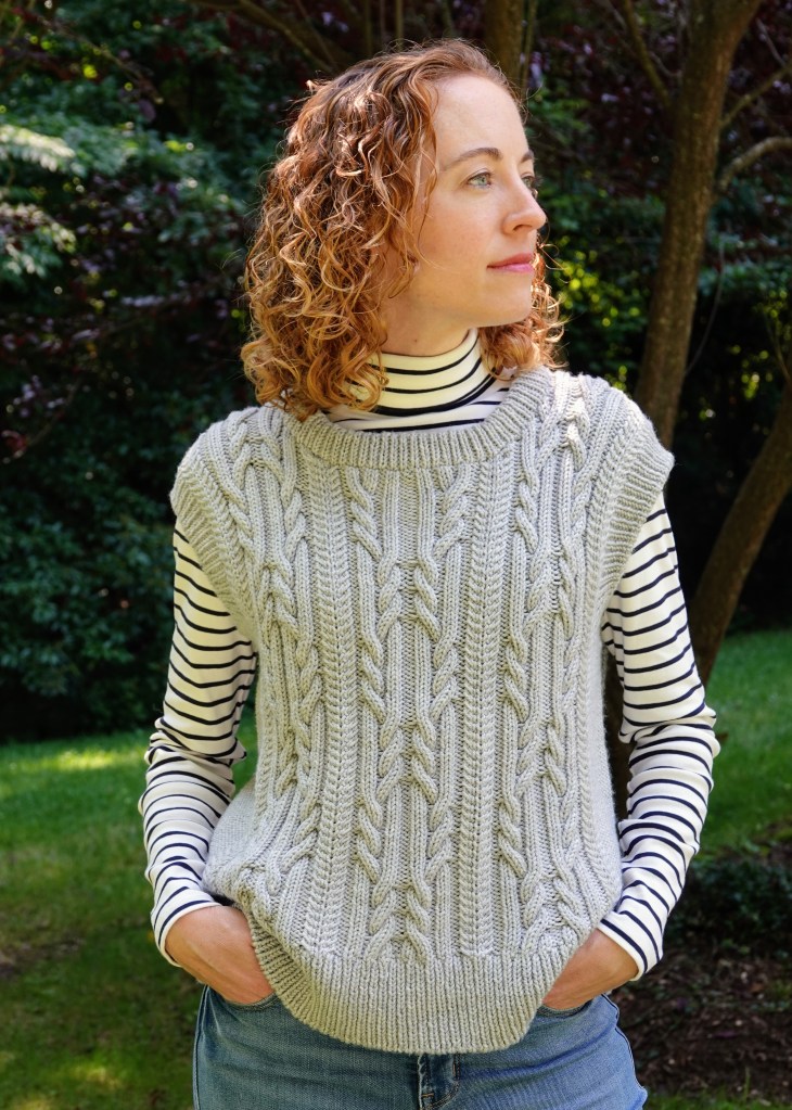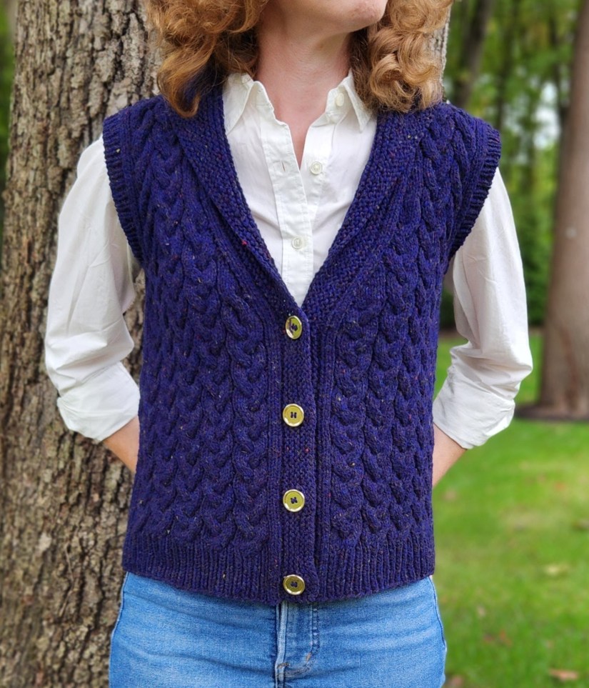 This design represents one of those happy times when an idea springs into my head almost fully formed. I first saw this yarn, Kingston by Jill Draper Makes Stuff, when I attended Jill’s open house during the Sheep and Wool Festival in 2023. The combination of the navy blue colorway with its subtle tweedy flecks and the bounciness of the Targhee wool yarn instantly caught my eye and made me think: classic cabled vest.