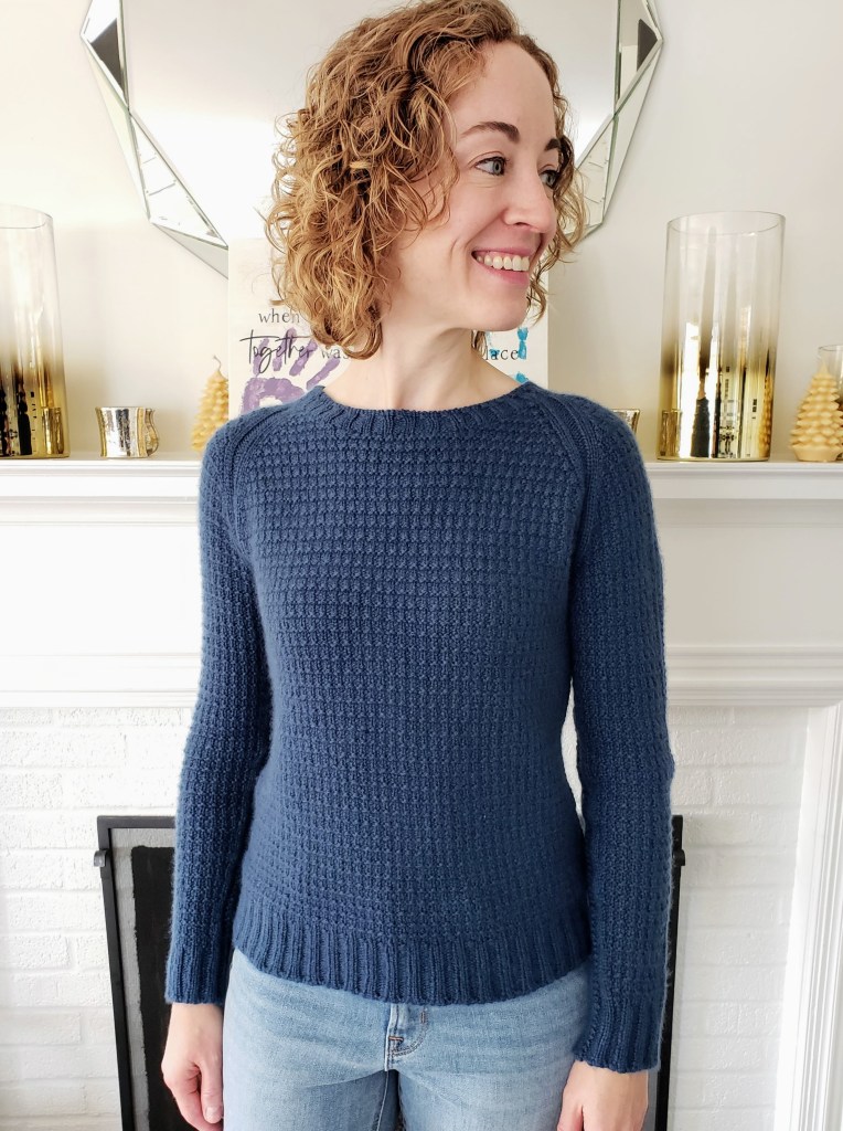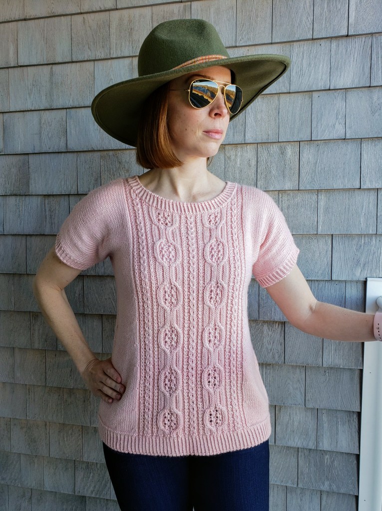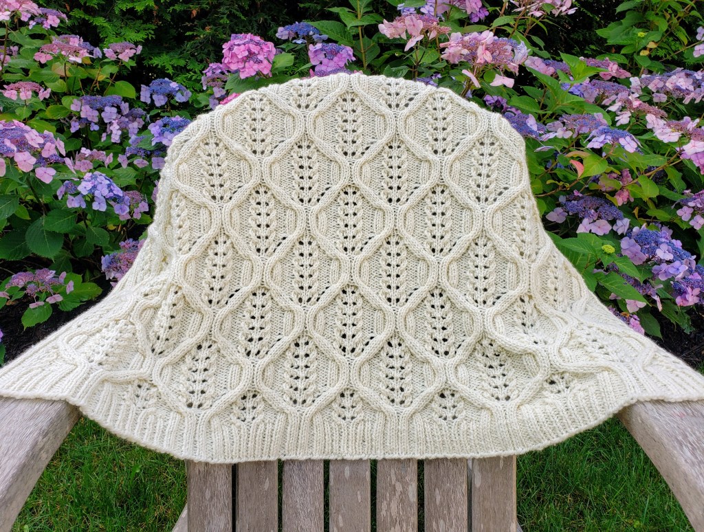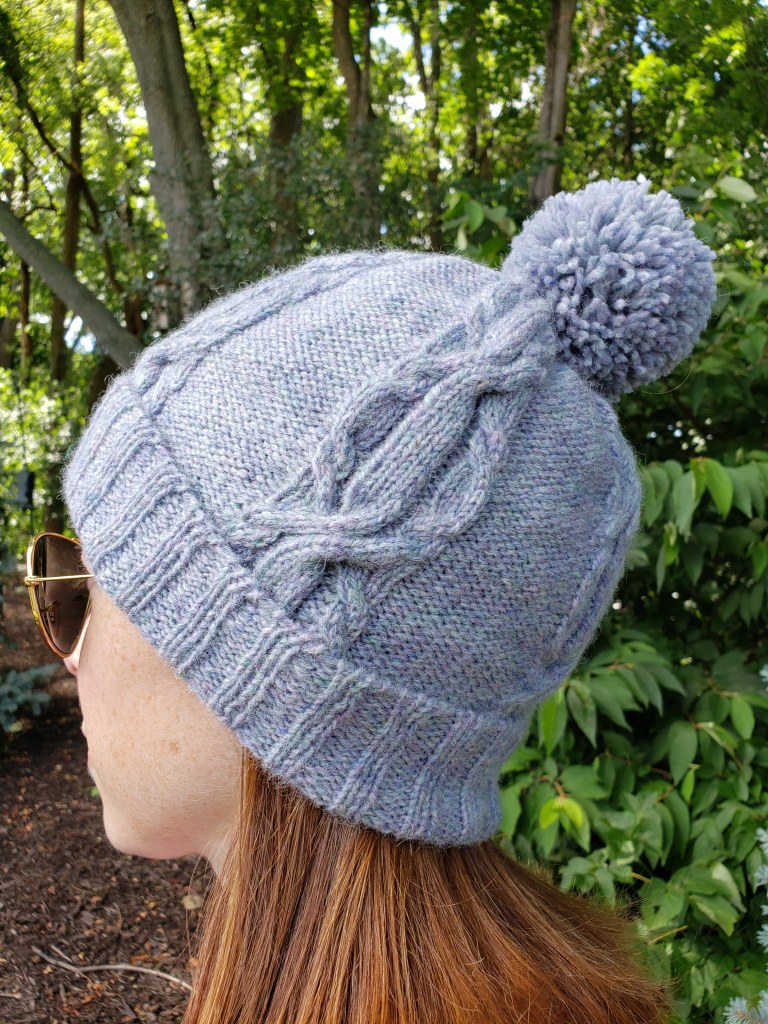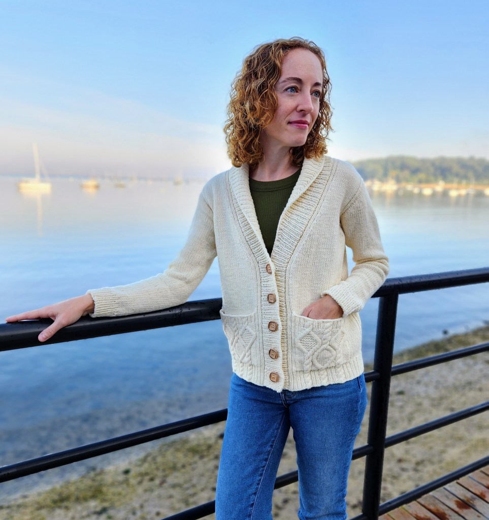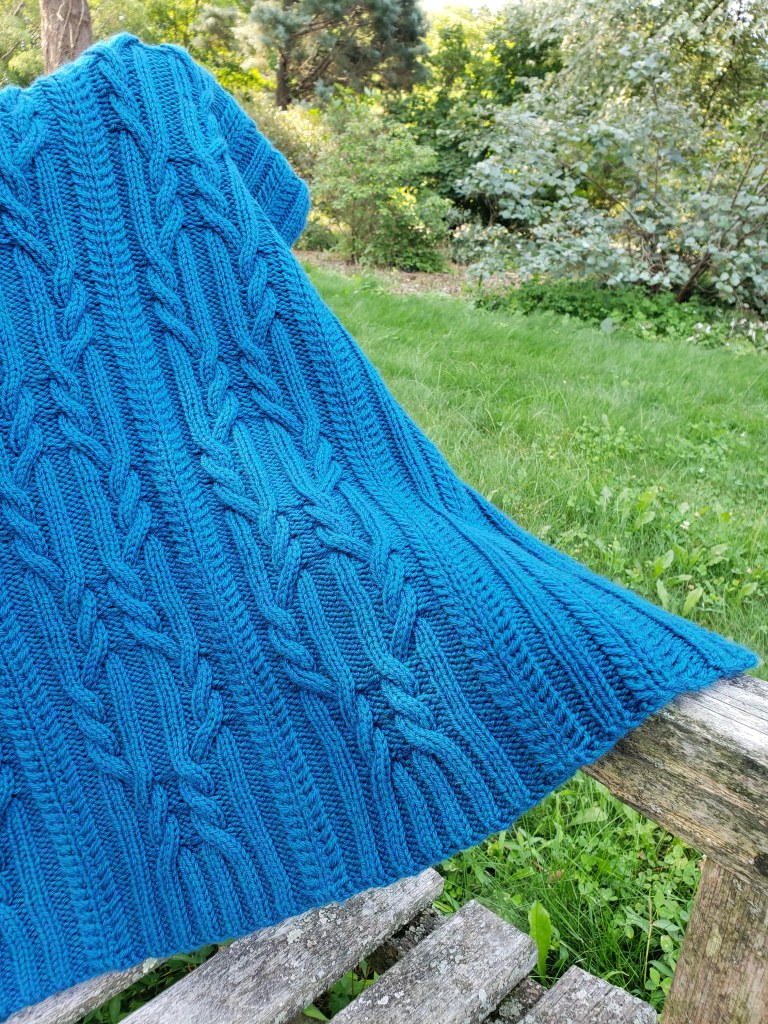 (Funnily enough, the name for the design also sprung to mind quickly – discovering the sapphire colorway “Delaware Ave” at Jill’s Open House event alongside the Hudson River, and working the vest in undulating cables reminiscent of flowing water, made the name “Riverbank” seem awfully apt.)