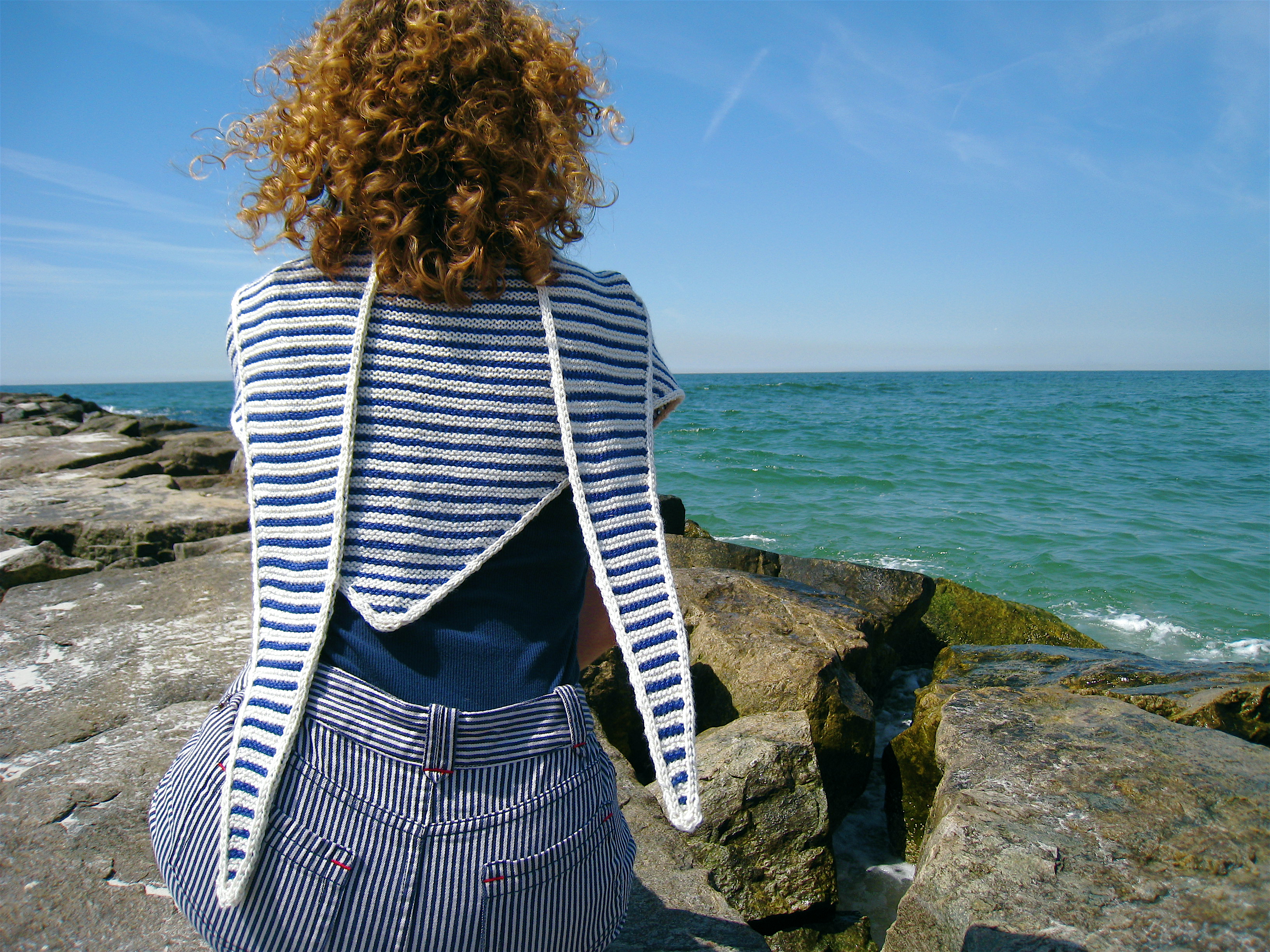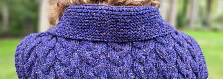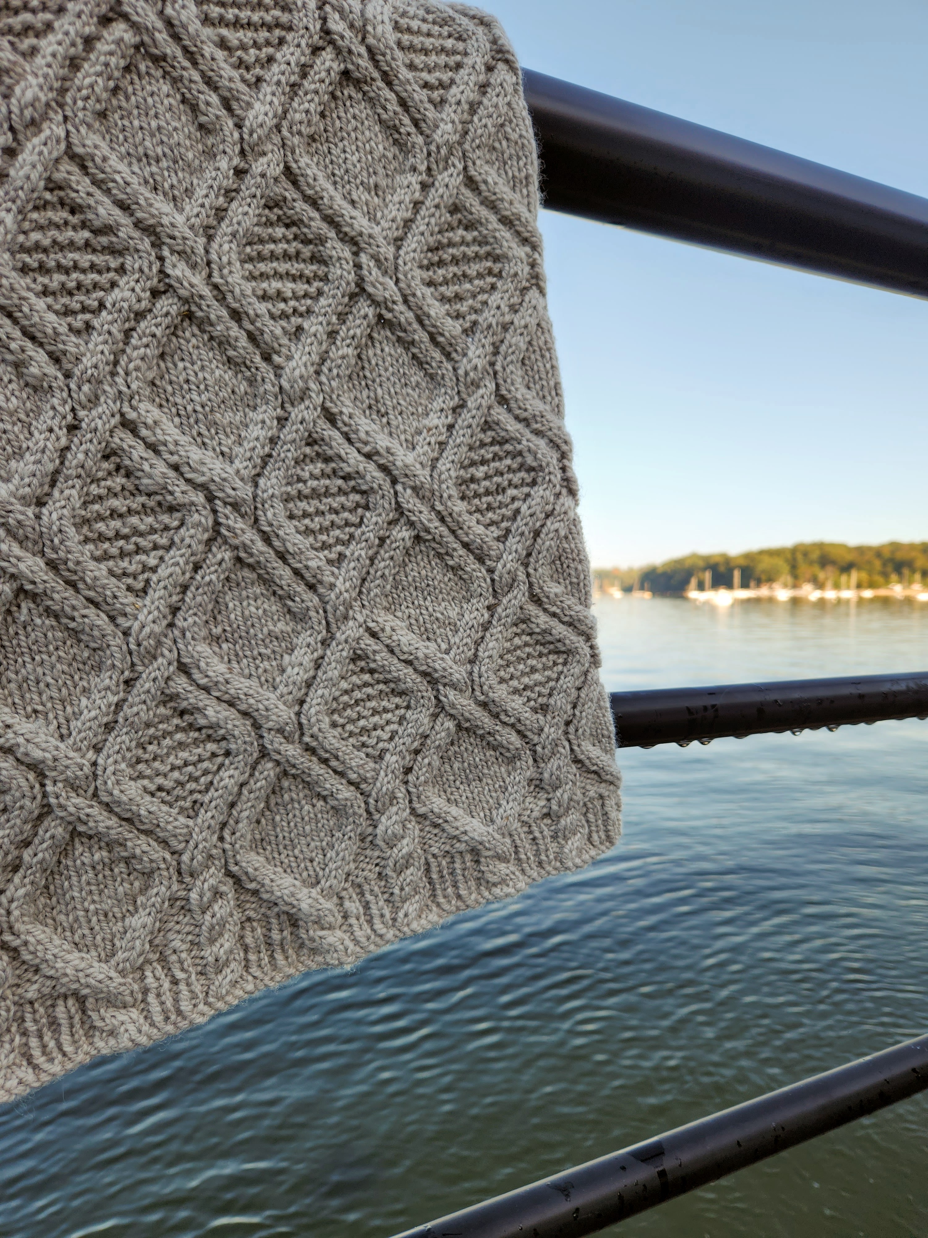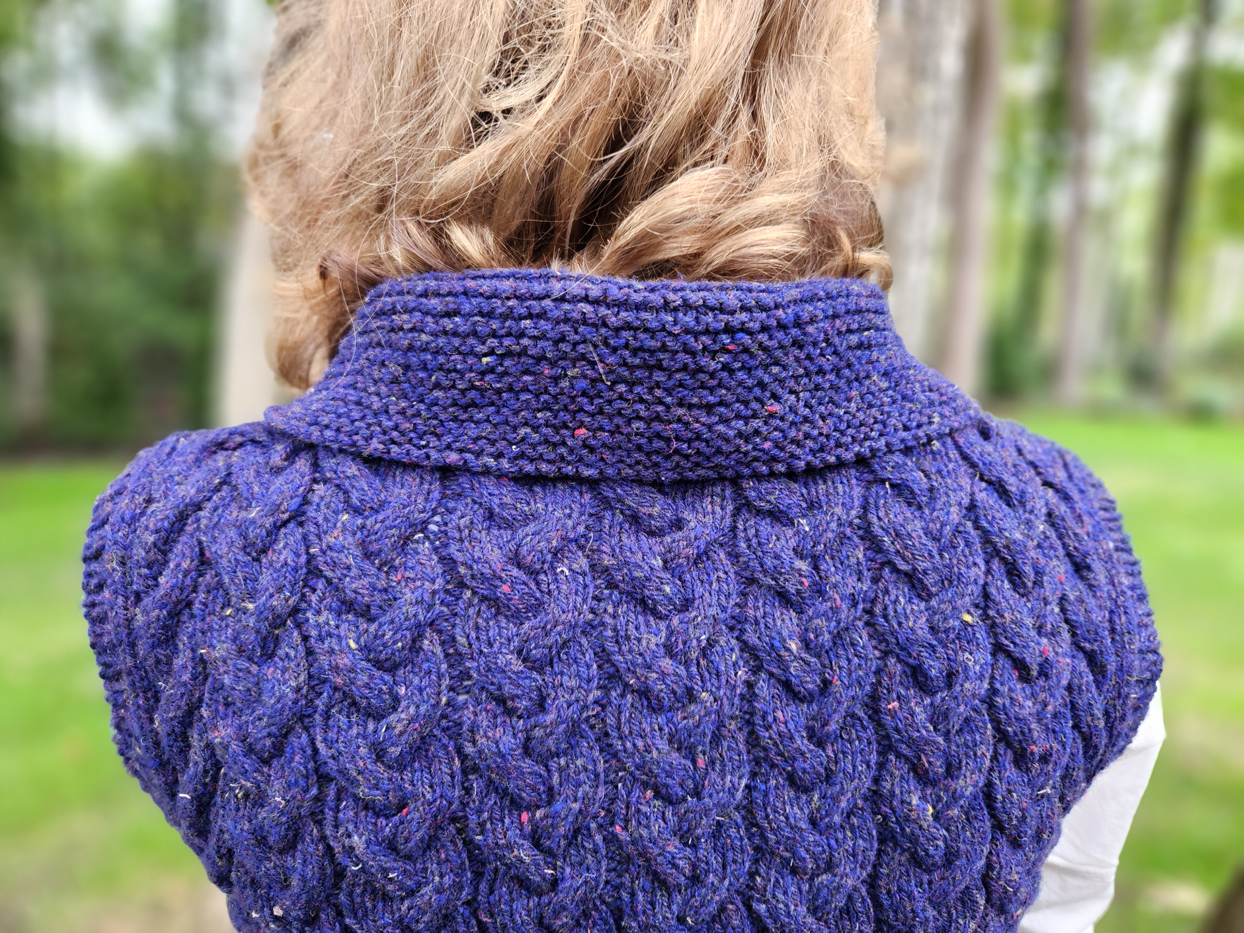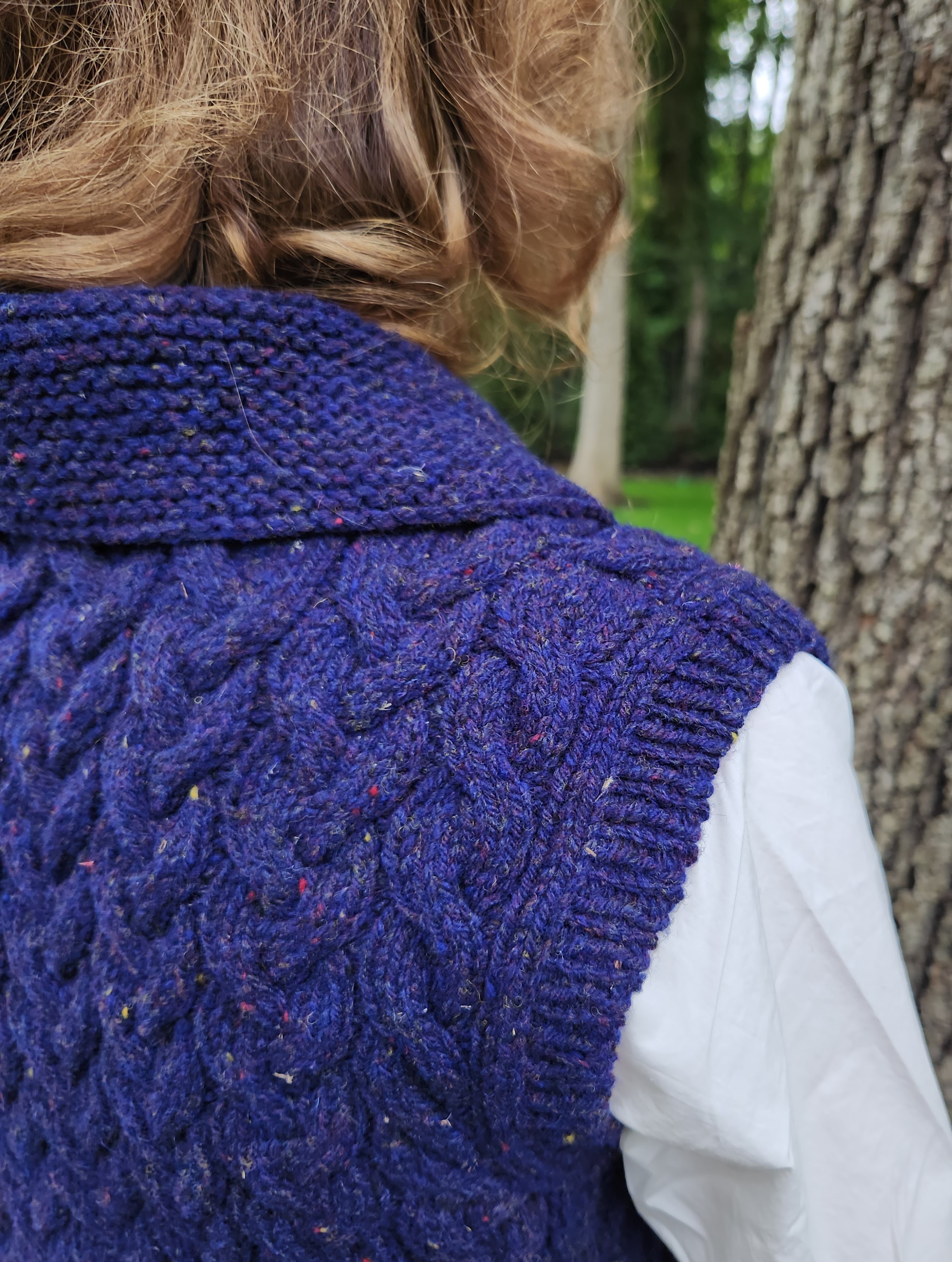 (Funnily enough, the name for the design also sprung to mind quickly – discovering the sapphire colorway “Delaware Ave” at Jill’s Open House event alongside the Hudson River, and working the vest in undulating cables reminiscent of flowing water, made the name “Riverbank” seem awfully apt.)