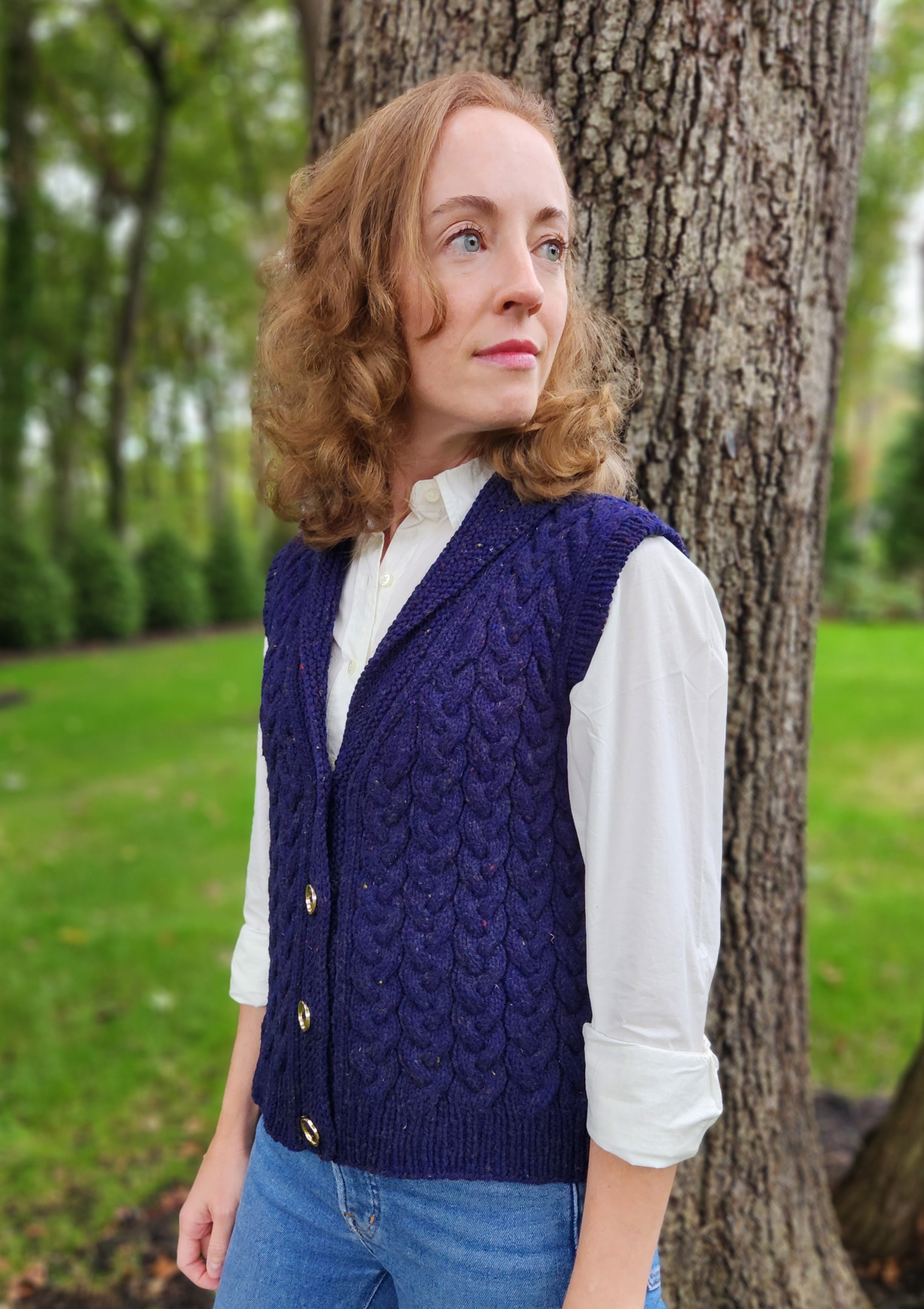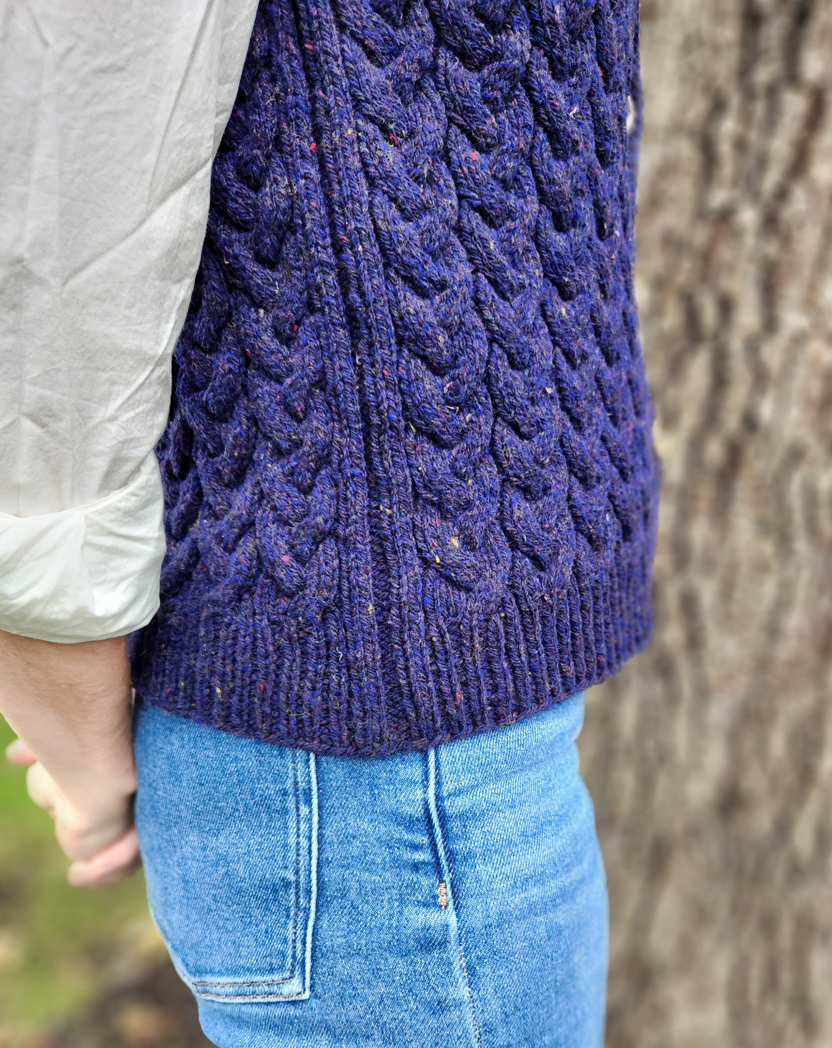 This design represents one of those happy times when an idea springs into my head almost fully formed. I first saw this yarn, Kingston by Jill Draper Makes Stuff, when I attended Jill’s open house during the Sheep and Wool Festival in 2023. The combination of the navy blue colorway with its subtle tweedy flecks and the bounciness of the Targhee wool yarn instantly caught my eye and made me think: classic cabled vest.