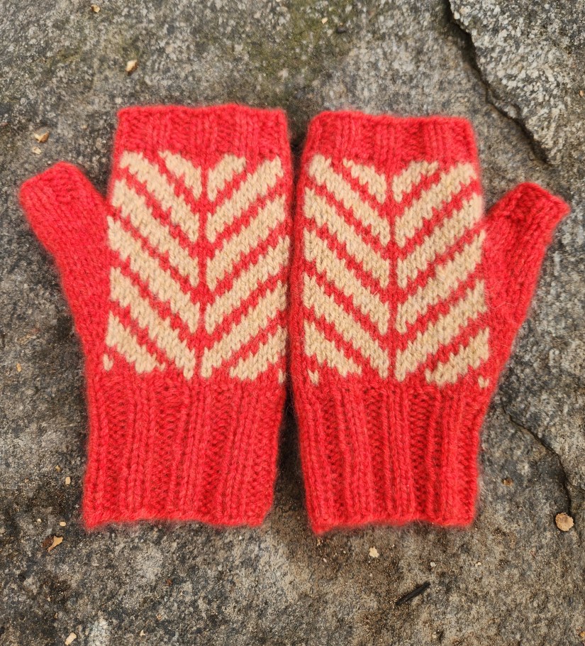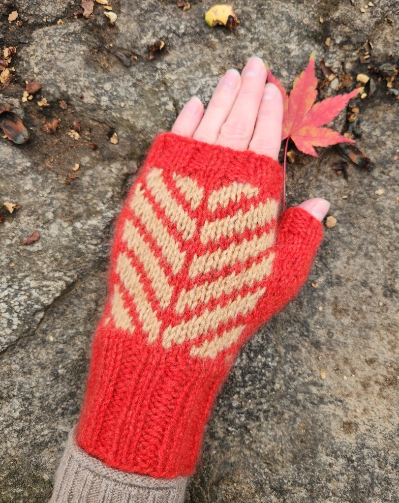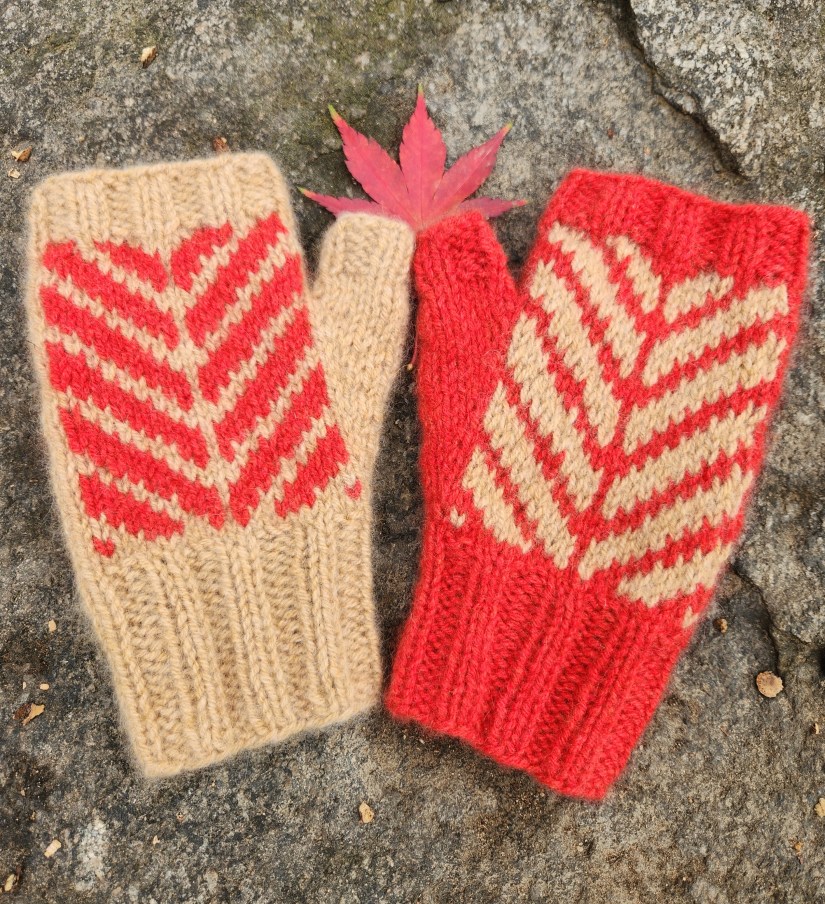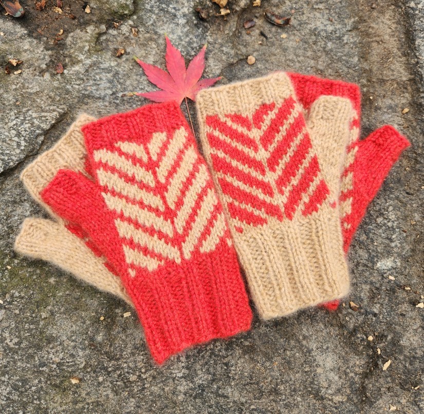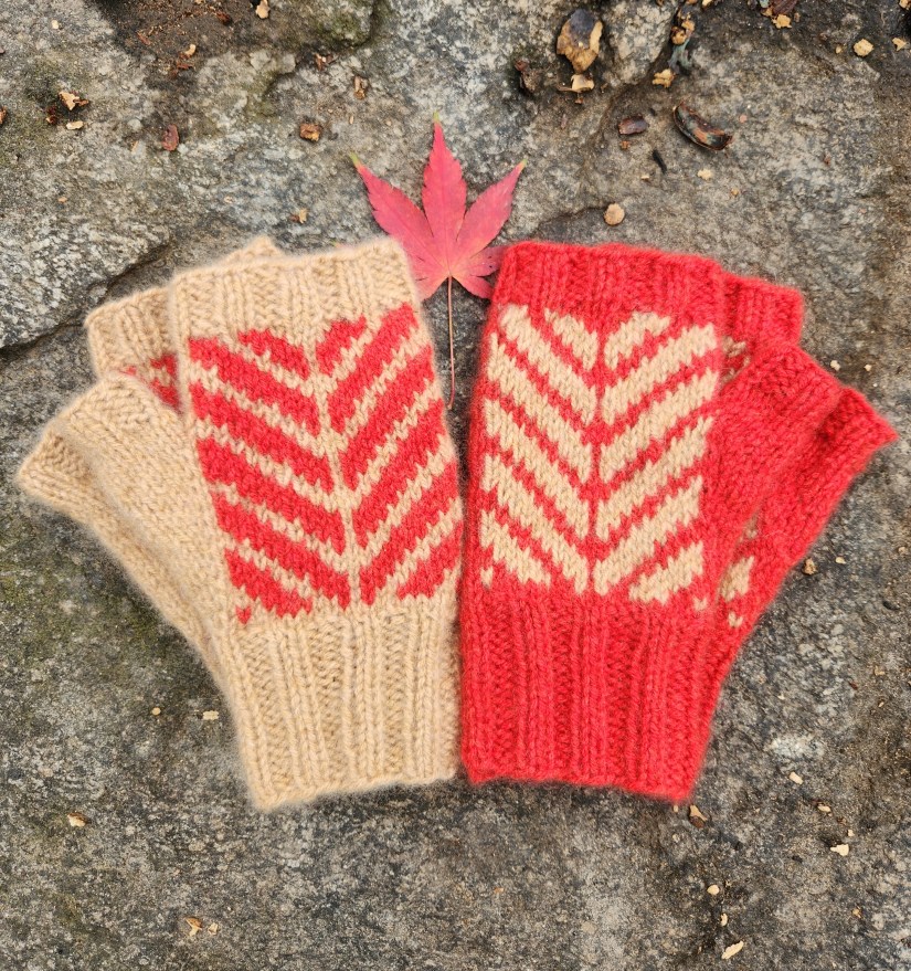 I’m particularly pleased by how little yarn these mitts require. The pattern includes three teenage/adult sizes, with two charts for each size, so that you can create matching mitts or mismatched mitts. For a matching pair of mitts, you’ll need 100 yards or less of your main color and 50 yards or less of your contrasting color. For a mismatched pair, you’ll only need 75 yards or less of each color! In the pictures you see here, I only needed one skein of each color of Bespoke DK to complete all four of these medium-sized mitts!