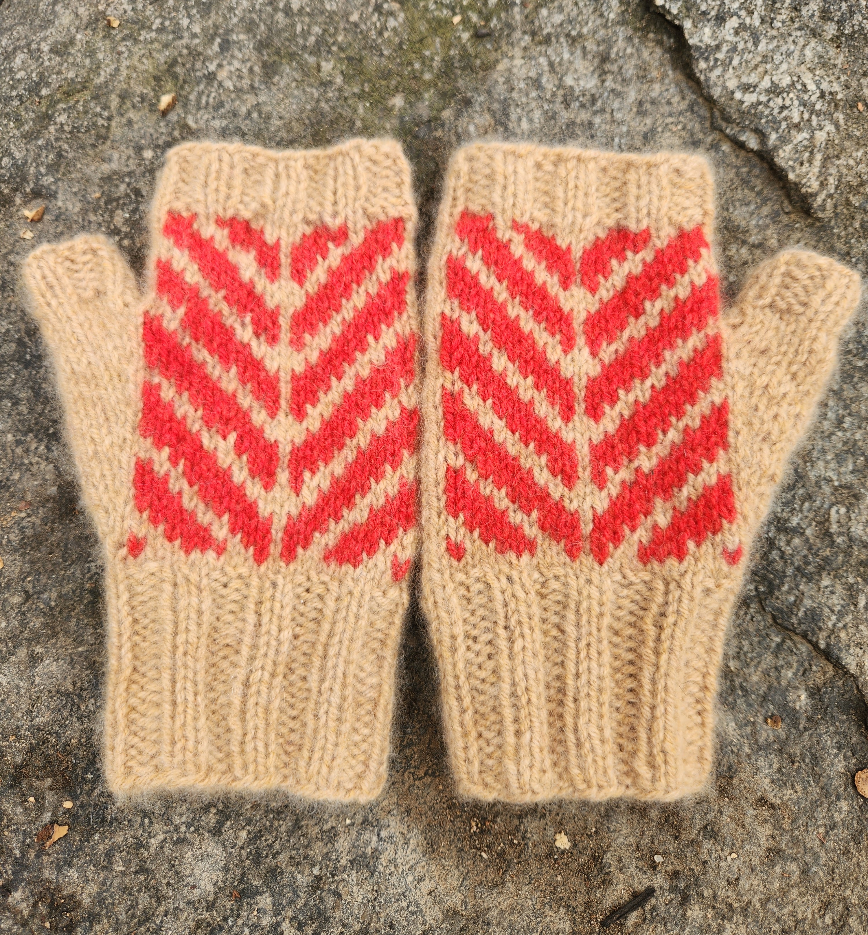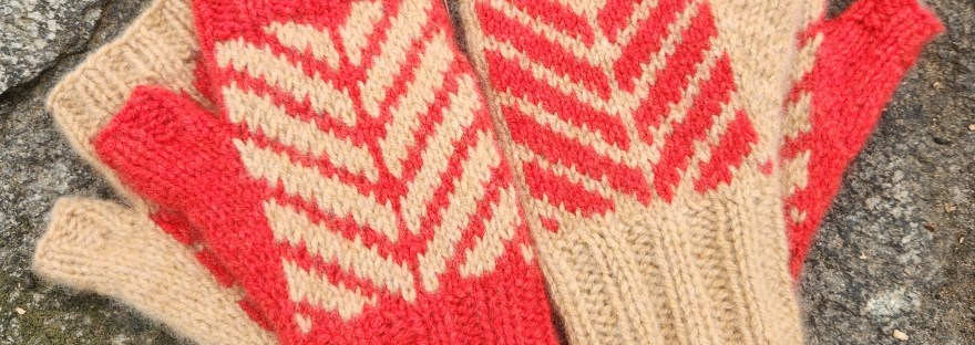 Mitts Match are worked in the round from the lower cuff up to the top of the hand. The thumb gusset and hand are worked simultaneously with simple stranded colorwork, and the pattern includes links to online resources where you can learn more about stranded colorwork, floats, and reading colorwork charts.  The thumb stitches are held while the hand is completed and then the thumb is finished.
