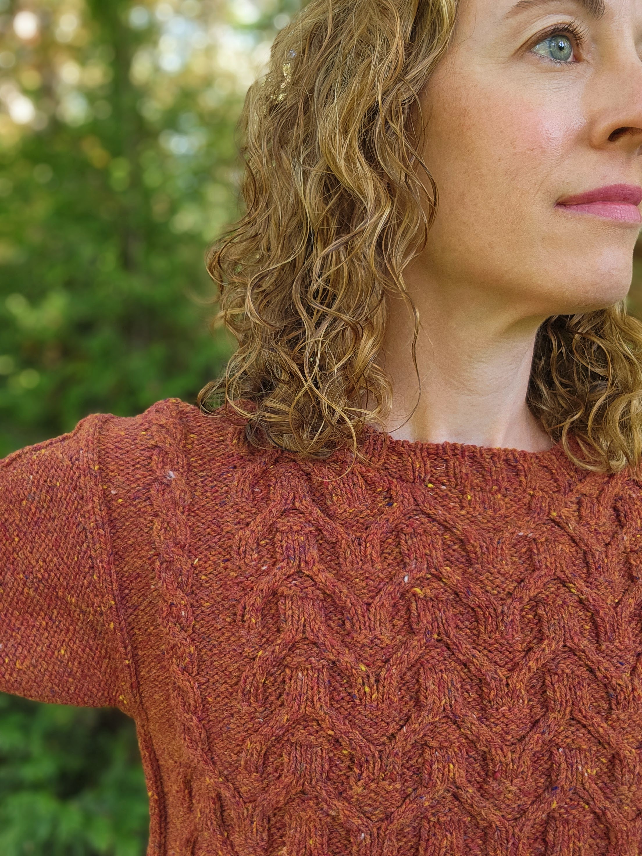 To balance all of the cable patterning, I kept the shape of the pullover simple: no waist shaping, an oversized profile, a modified dropped shoulder shape, and a cozy crewneck.
