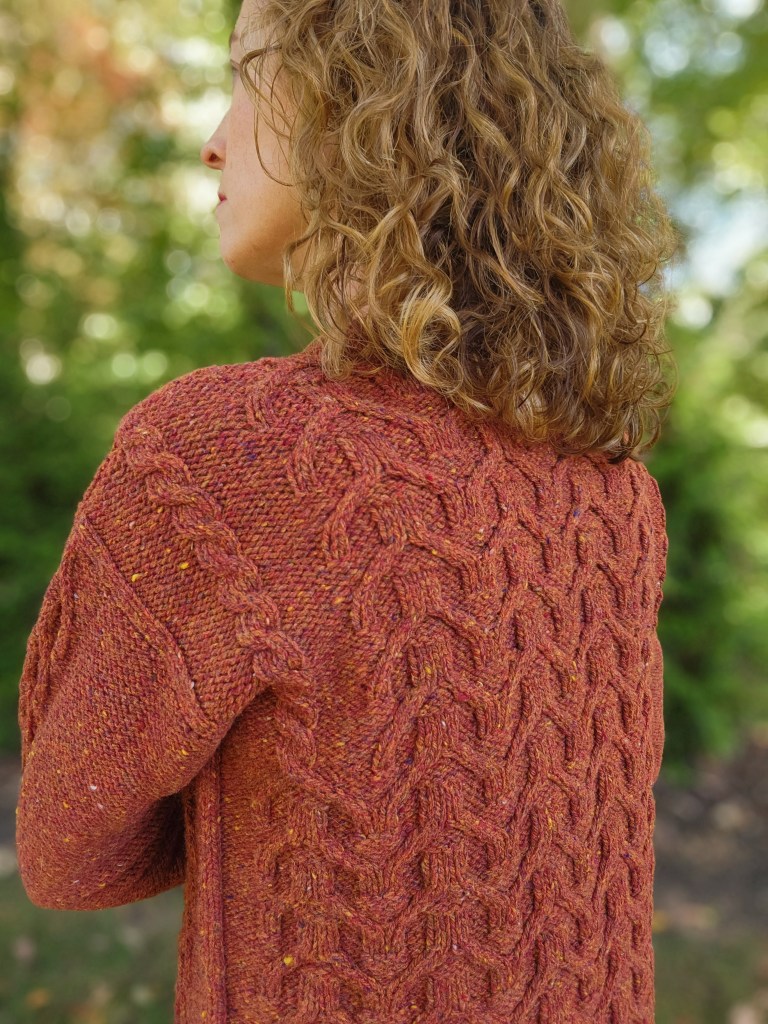 Choose a size that provides approximately 5-6” of positive ease in the chest. The texture of the cables shows up best in a solid or mostly solid colorway.
