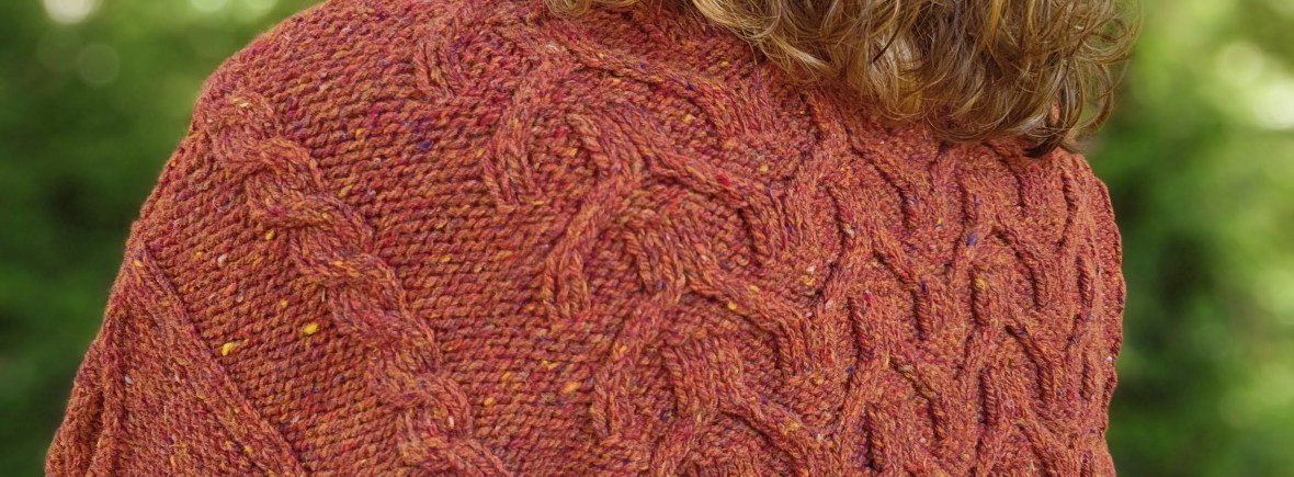 Choose a size that provides approximately 5-6” of positive ease in the chest. The texture of the cables shows up best in a solid or mostly solid colorway.