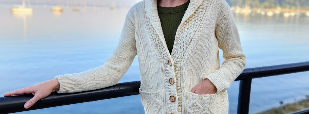 The body, including the pocket facings, is knit flat in one piece from the bottom up to the armholes. The right front, back, and left front are individually knit flat and then seamed at the shoulders. Stitches are picked up around each armhole to work the sleeves in the round down to the cuff. The cuffs feature professional (and optional) tubular edges. Stitches are picked up around the neckline to work the ribbed shawl collar and buttonband flat. The pocket linings are sewn to the inside of the body and the buttons added to the left front.
