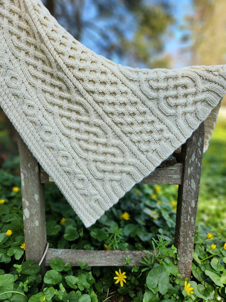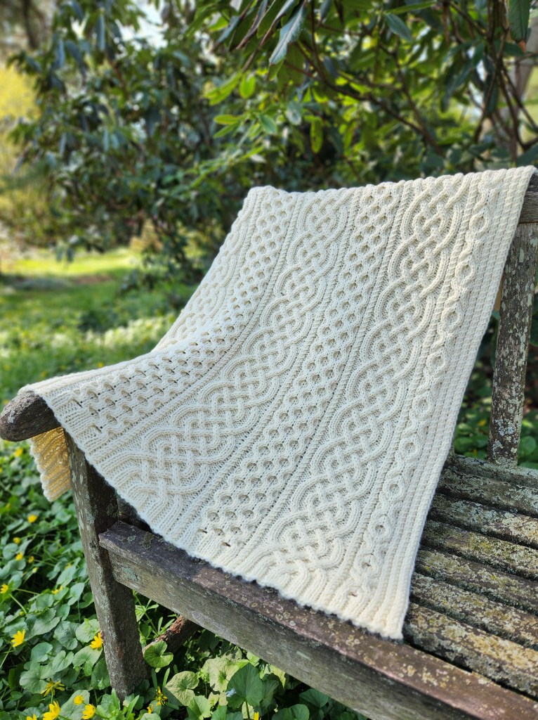 Three different, but complementary, cable patterns gracefully wend their way along the surface of the Magnolia Blanket. Slipped stitch edges, with small cable twists at each edge, and ribbed borders ensure that the blanket lies flat. A solid or mostly solid color of yarn honors this timeless design.
