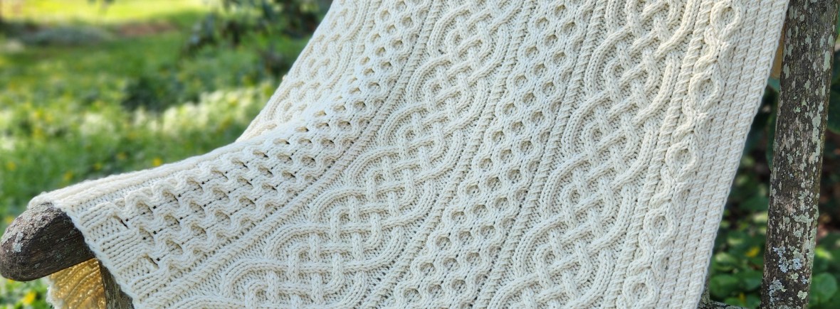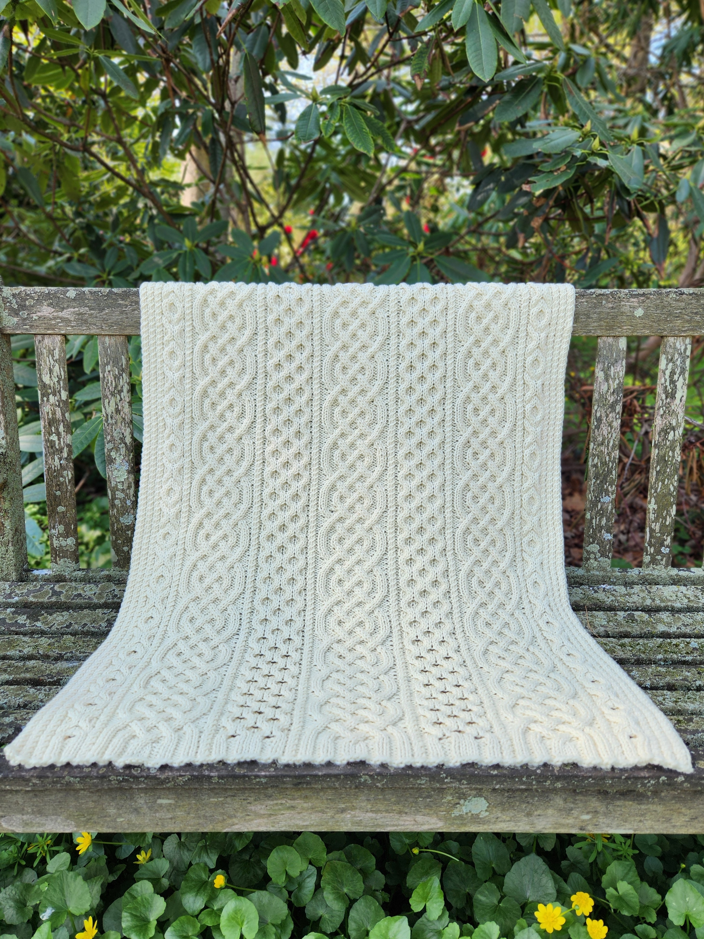 Three different, but complementary, cable patterns gracefully wend their way along the surface of the Magnolia Blanket. Slipped stitch edges, with small cable twists at each edge, and ribbed borders ensure that the blanket lies flat. A solid or mostly solid color of yarn honors this timeless design.