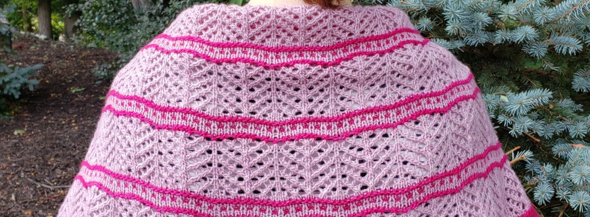 The Jamberry shawl is an elegant crescent-shaped shawl featuring arrowhead lace interspersed with rows of slip stitch colorwork. Jamberry can be knit with either laceweight yarn (held doubled as shown) or fingering-weight yarn (held single). See the Materials list to determine the necessary yardage for your chosen yarn.