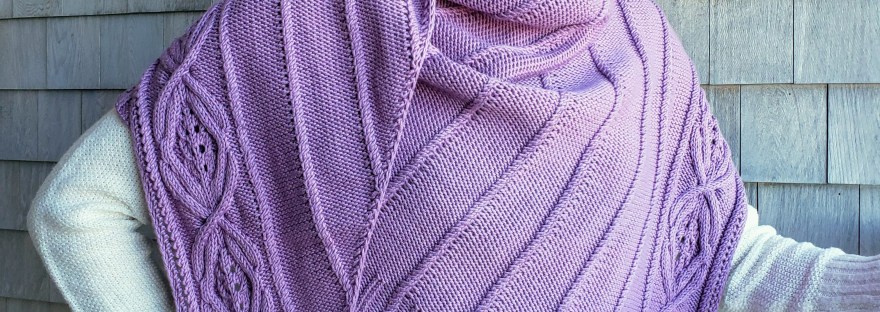 Avocet is the perfect reminder that a knitted shawl/wrap is not only for the cold weather! This asymmetrical triangular design is worked flat in one piece. It features a striking cable panel offset by a sleek reverse stockinette stitch body accented by simple rope cables.